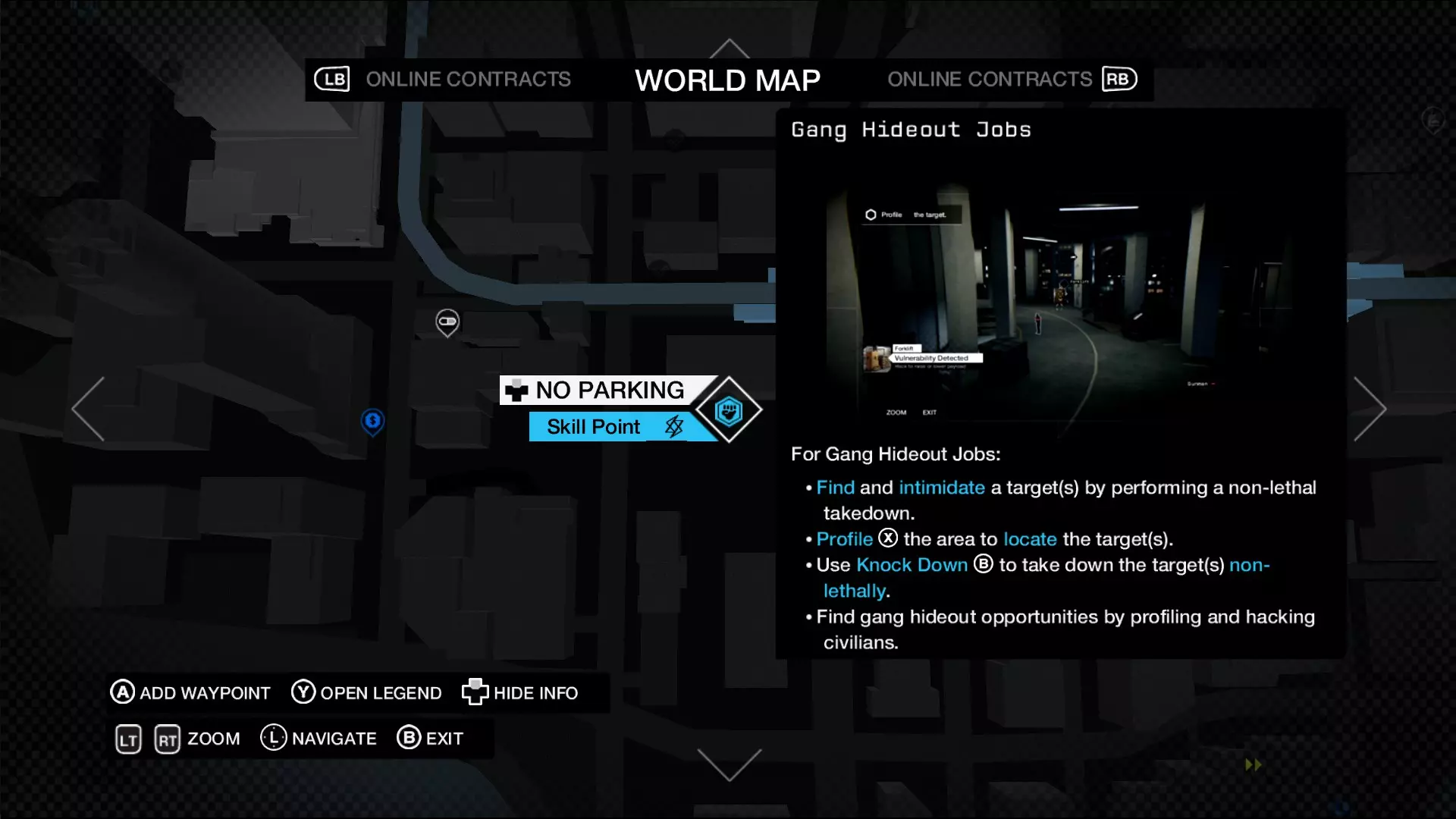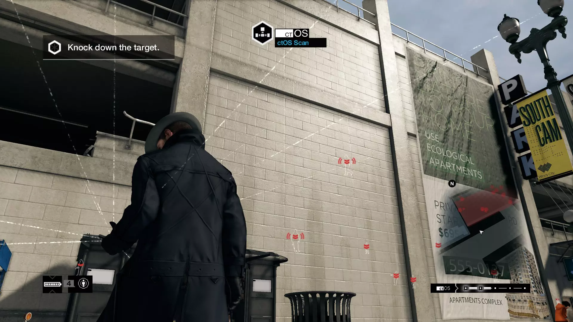 我还应该提一下支线任务,因为完成它们需要不同于单纯潜行击杀附近所有敌人的策略。 共有15个帮派藏身处。所有帮派藏身处的目标都是先标记目标,然后击倒目标。注意我特意强调了“击倒”,这是因为你不能杀死目标。你只能用警棍对目标进行近战攻击。至于其他敌人,你可以随意击杀。 帮派藏身处并不难。只要你先用摄像头甚至城市操作系统扫描来勘察区域,就能定位所有敌人的位置。但在处理任何敌人之前,你必须先标记目标。 例如,使用城市操作系统扫描来定位所有敌人的位置。