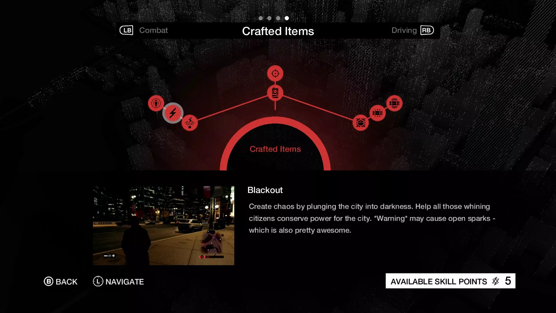 接下来我们来了解制作物品技能树。左侧分支是CtOS漏洞利用,包括通讯干扰、断电和CtOS扫描。我强烈建议你至少解锁到断电技能。为什么呢?因为断电能帮你摆脱棘手的局面,比如被来自不同角度的敌人射击,或者需要额外的黑暗掩护来避免被发现。当然,断电技能【仅在夜间】有效。通讯干扰可用于阻止敌人呼叫增援、取消针对你的警方呼叫,或是躲避芝加哥警局的CtOS扫描。CtOS扫描能让你扫描一片区域并标记出敌人位置(在帮派藏身处非常有用,但并非必需)。 中间分支只有专注强化,制作后能让你获得满值的专注值供使用。适合激烈交火且你已耗尽专注值时使用。使用一个就能让你恢复状态。我通常不会把它列为优先项,因为不常使用。最好先提升专注技能,再考虑专注强化。 右侧分支是爆炸物。其中包括破片手榴弹、简易爆炸装置和感应式简易爆炸装置。我必须强调简易爆炸装置非常有用,尤其是对付犯罪车队(我很快会讲到)。 制作的投掷物,比如破片手榴弹和简易爆炸装置,会是我的首选,其次是通讯干扰和断电。其他的在游戏后期才需要。 驾驶技能