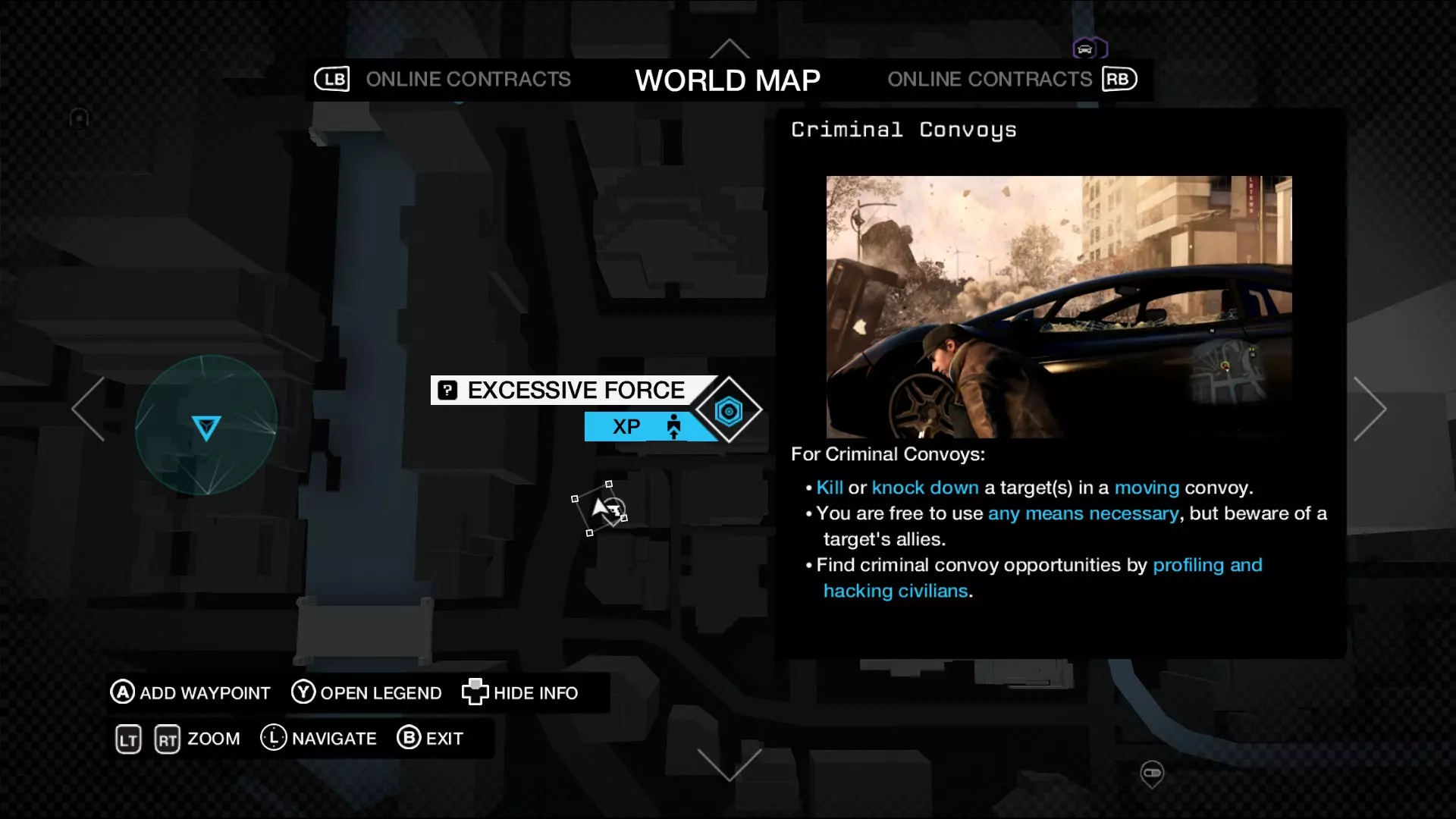 另外值得注意的是,我会用手榴弹对付其他敌人,这样就不会意外暴露自己的掩护并被击杀。 支线任务:中间人合约 关于中间人合约没什么太多可说的。这些支线任务通常涉及驾驶。合约根据完成速度分为金、银、铜三个等级。争取拿到金牌,这样能从合约中获得最多的钱。合约有四种类型:运输、拦截、诱饵和逃脱。 运输:驾驶载具前往目的地,期间尽量避免载具受到过多损坏。通常需要驾驶两到三辆载具。 拦截:在移动中近距离跟踪目标,同时从他身上下载数据,然后将其消灭。如果你想更快结束任务,可以在下载期间直接摧毁他的车,杀死他,然后入侵他的手机。 诱饵任务:驾驶指定车辆通过检查点,同时警方会使用城市操作系统扫描来追踪你。被扫描不会有惩罚,所以只需专注于尽量减少失误驾驶,并尽快到达终点。 逃脱任务:驾驶指定车辆摆脱追兵。一旦摆脱追兵视线,就将车辆开到目的地。追兵可能是警察或其他杂项敌人(中间人、芝加哥南区俱乐部、总督帮)。最好快速驾驶并使用环境入侵来摧毁追击车辆。
