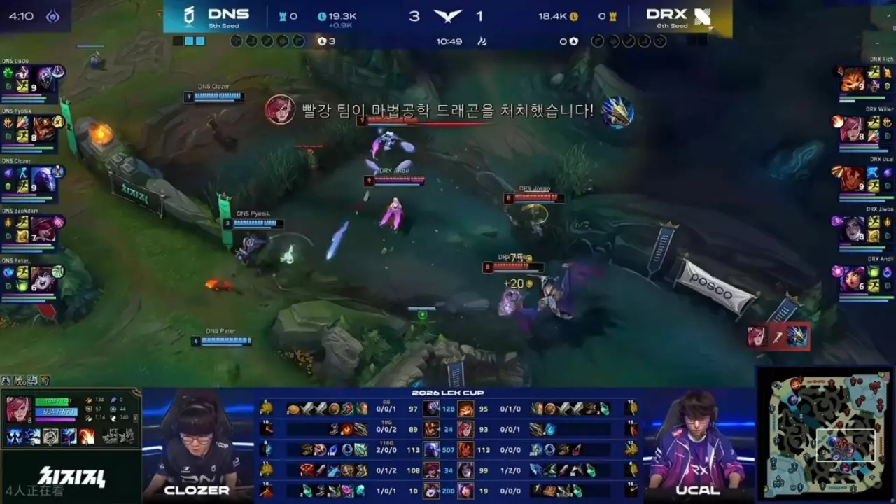 DRX下路前期炸穿之后,Pyosik没想着去控龙,11分钟DRX就拿到了两条小龙,停牌龙因为上单给机会被抓,DNS又不敢接团,最后的龙魂团,人终于到齐了,结果团战打输了,DRX拿下龙魂+大龙,直接完成翻盘,下路优势不拿小龙,经济领先连续输团,DNS这场打得,完全不像人。