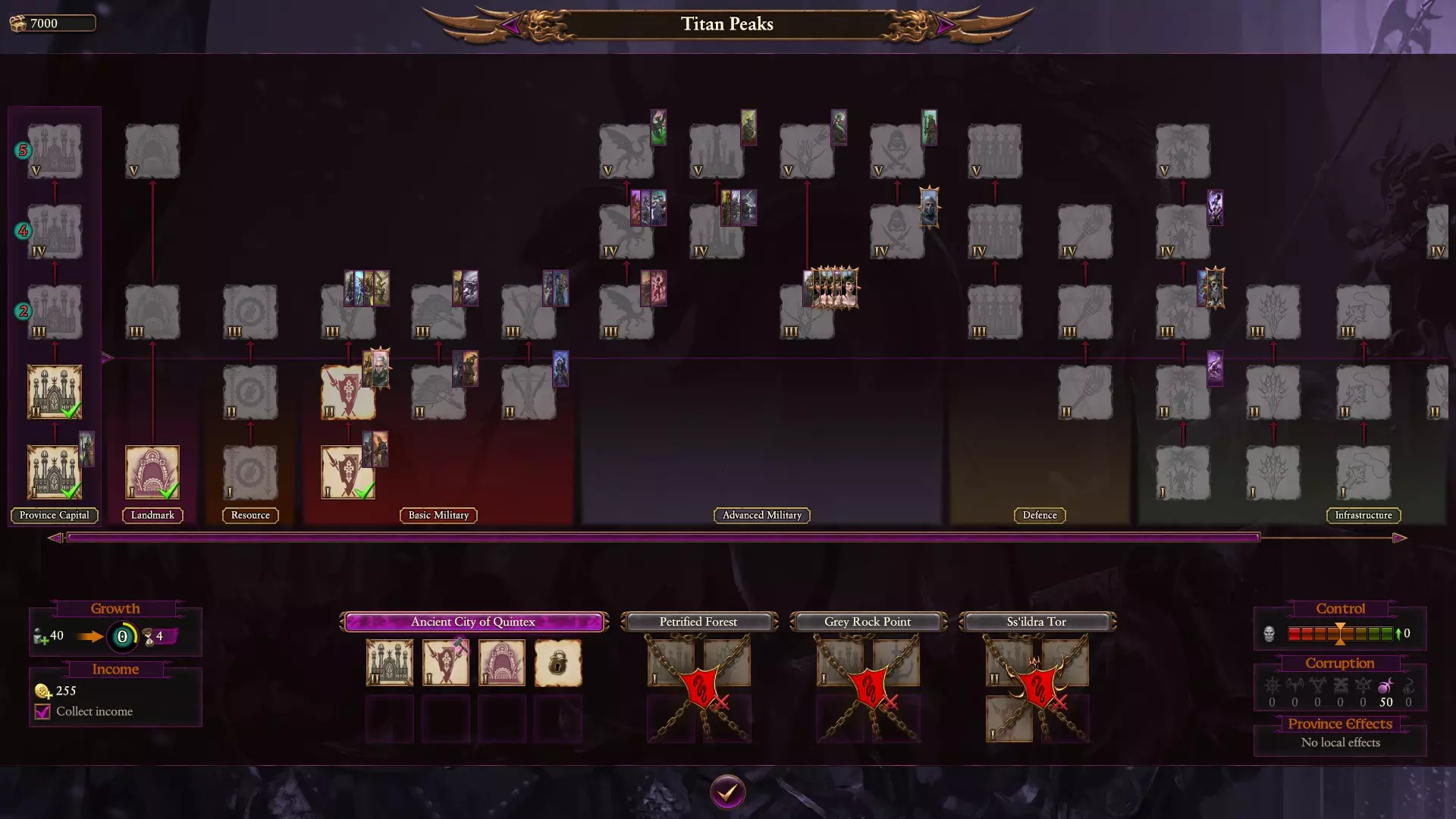 3座特殊建筑,包括【黑暗亲王宫廷】;地标建筑【昆泰克斯圣所】能为你提供大量收入、控制力、增长值和研究速率,而【黑暗亲王宫廷】则能提供色孽腐蚀值、英雄容量、死亡女巫等级以及更多控制力,还能招募【高阶 daemonettes】。 8座军事建筑,包括 daemonettes 建筑;其中3座可在小型定居点建造,且它们的3级单位已相当出色。暗影部队、重步兵、炮兵、骑兵、怪物……仅依靠3级单位,你在一段时间内就能表现良好。 2级建筑即可招募 daemonettes,这对于快速移动的军队尤其有帮助,让你能在早期造成大量伤害。基础设施: 1 - 增长值、伤亡补充率、派系奴隶容量、奴隶收入; 2 - 收入、每回合减少奴隶数量; 3 - 更低的控制度、每回合奴隶数量、更高的奴隶容量; 4 - 你的军队在战役中的移动范围、增长值、贸易收入、对迪克塔特派系的奴隶成本降低、所有建筑的收入。 总体而言,这些都是不错的选择,并且在军队方面有很多不同的选择。 研究方面与其他黑暗精灵派系略有不同,会提供一些腐蚀效果,以及对恶魔侍女的一些小 buff。总体来说,和所有黑暗精灵一样,这是一个很棒的研究树,增加了大量的战役和单位升级。值得在游戏初期查看并规划一些想要优先研发的科技。死亡女巫能提供补充,所以我认为你的大多数军队肯定都需要一名。 领主、技能、军队组成: 从蓝线开始,该线路后半部分有维护费用和补充相关的技能。前半部分有【恐怖奴隶主】技能,可以从战斗中获得更多伤亡,这有助于获取更多奴隶,是个不错的选择。 虽然你有恶魔侍女,但红线技能中没有任何能强化她们的...我更愿意将她们视为前哨单位。 红线技能性价比不高,主要是因为它将精英单位、骑兵单位和怪物单位分开强化。如果你希望军队多样化,升级所有单位的成本会很高。