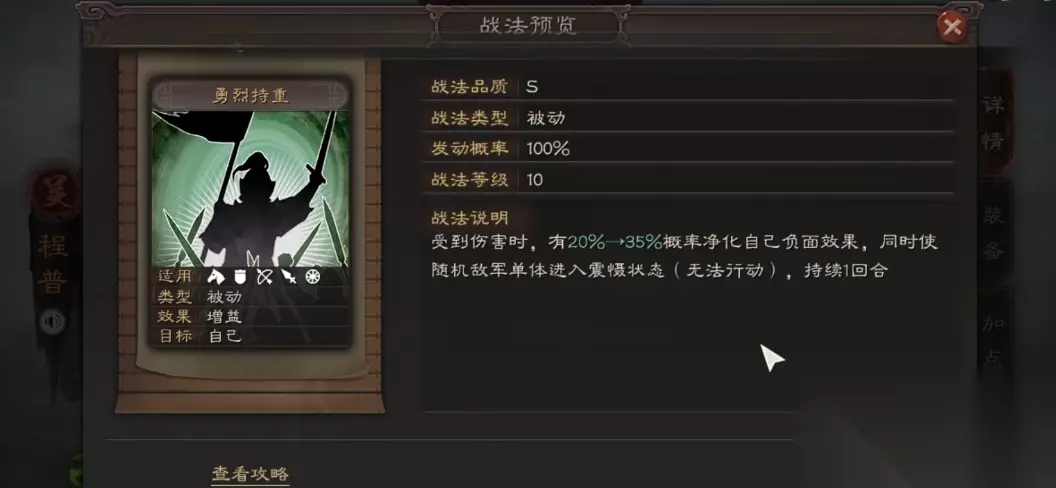 想让程普的控制更稳定,记得给他带嘲讽或援护类战法,比如唇枪舌战或千里驰援。这些战法能让程普吸收更多普攻伤害,从而频繁触发自带战法的震慑效果。如果玩的是盾兵阵容,藤甲兵也是个不错的选择,能大幅降低兵刃伤害,但要注意避开火攻队。兵书方面推荐无战而胜+守势+铁甲,进一步强化减伤和生存能力,毕竟程普站得住才能持续给队伍提供控制和支持。