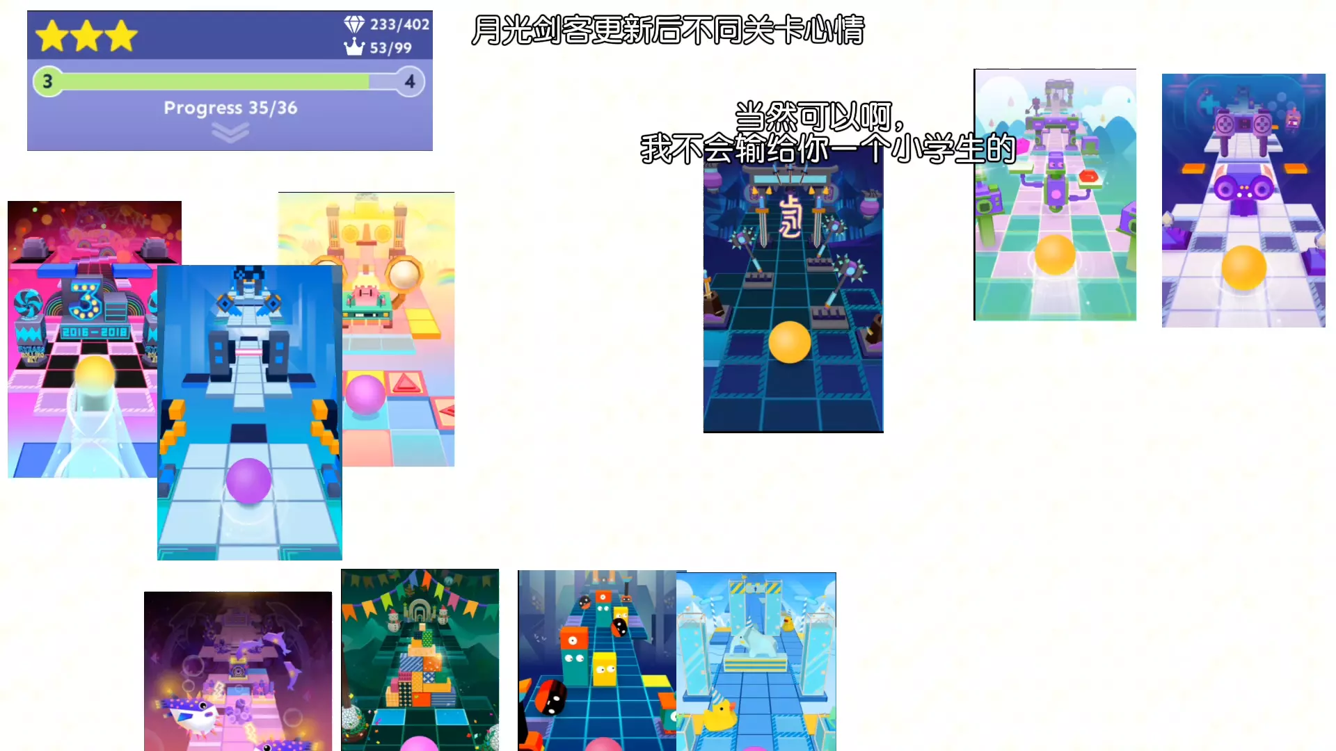 这是《滚动的天空》月光剑客版本的内容,展示了各星级正数第一关的同时播放画面,还包含愚人节关卡,呈现了不同关卡的跑酷场景与进度。