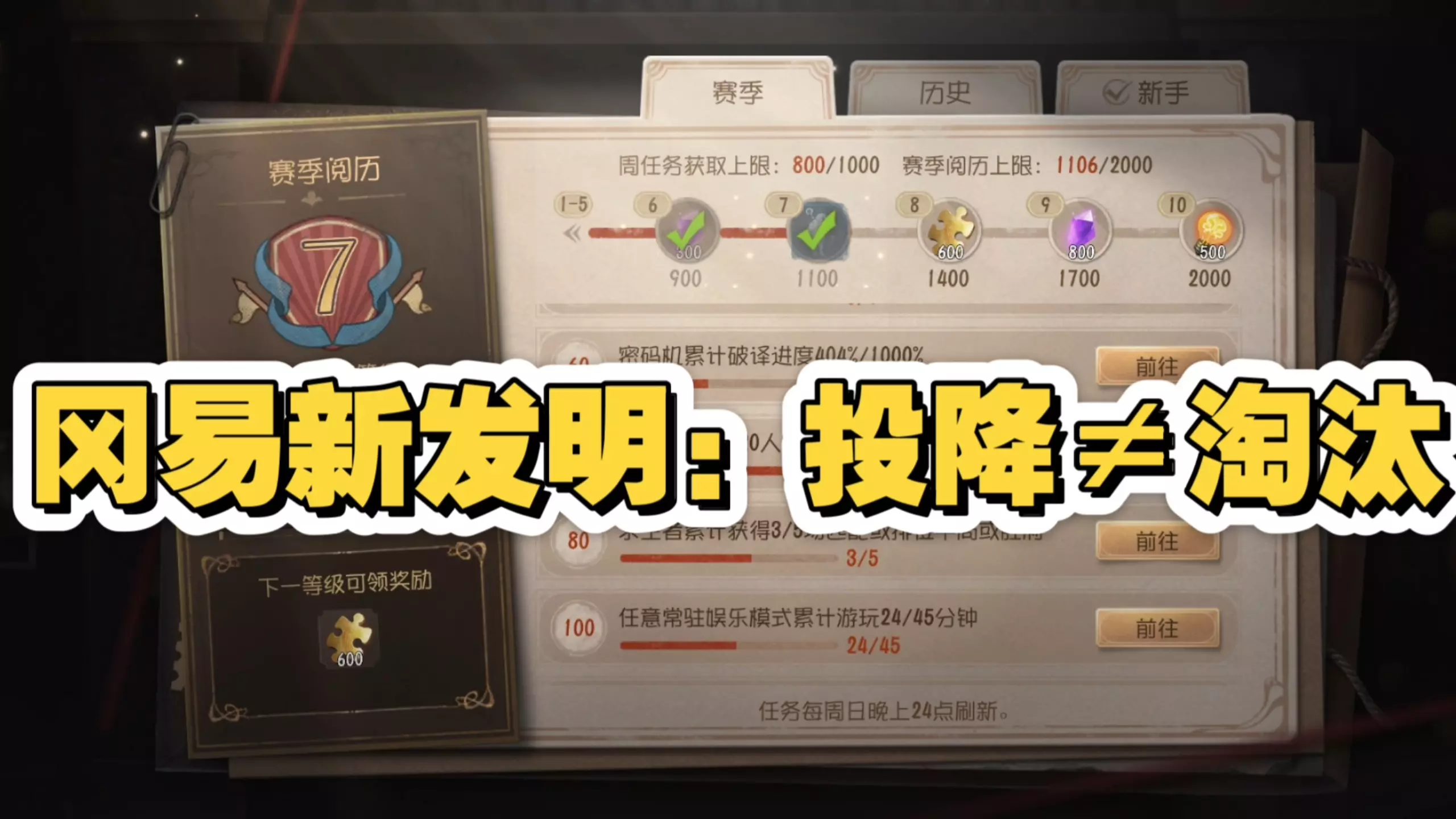 《第五人格》新赛季阅历肝度有所下降,但任务仍保留双阵营设定,还有超时空五天签到任务,玩家反馈周四开启该签到任务难以完成,同时展示了赛季阅历任务界面及相关奖励。