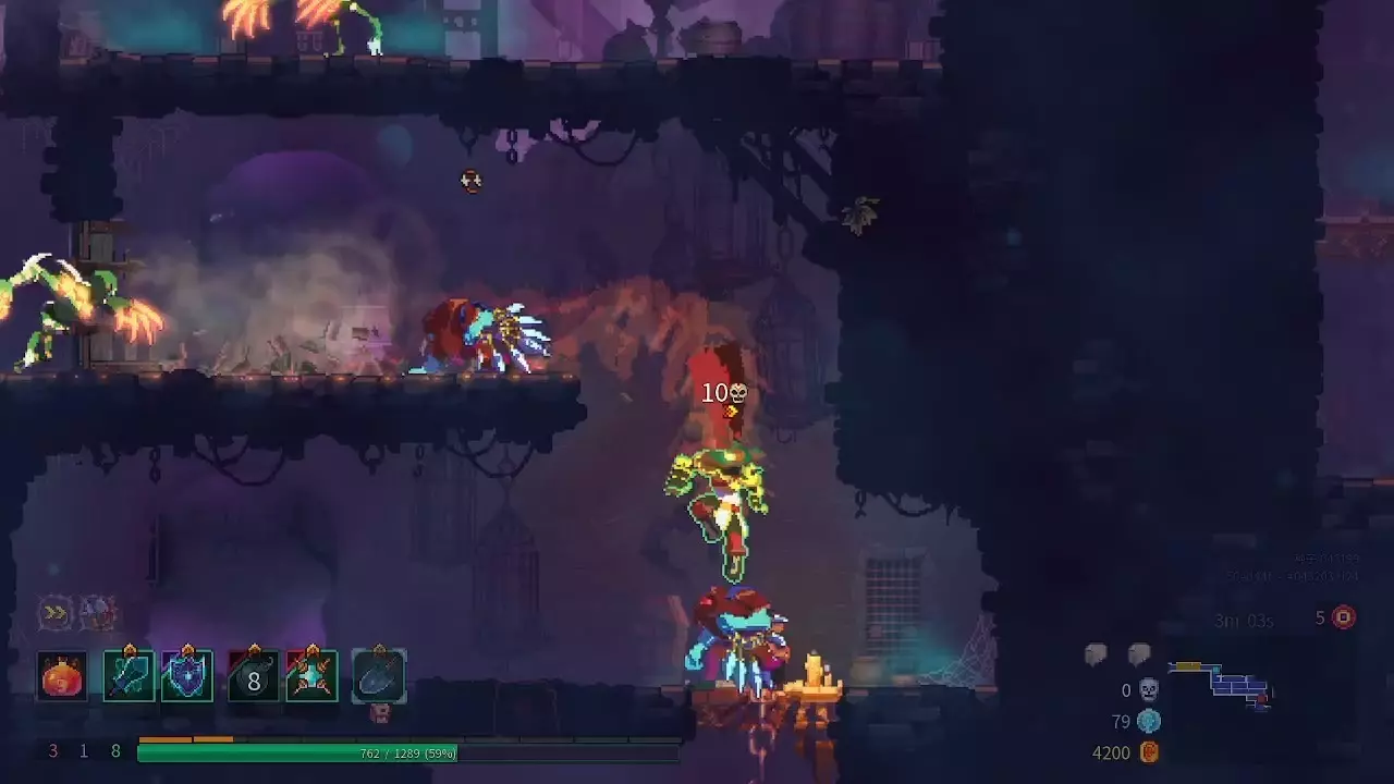这是《重生细胞》的游戏内容,展示了使用金蛋拐,无辅助无伤通关监狱深处的战斗过程,画面呈现了战斗中的攻击操作、伤害数值以及道具拾取等内容。