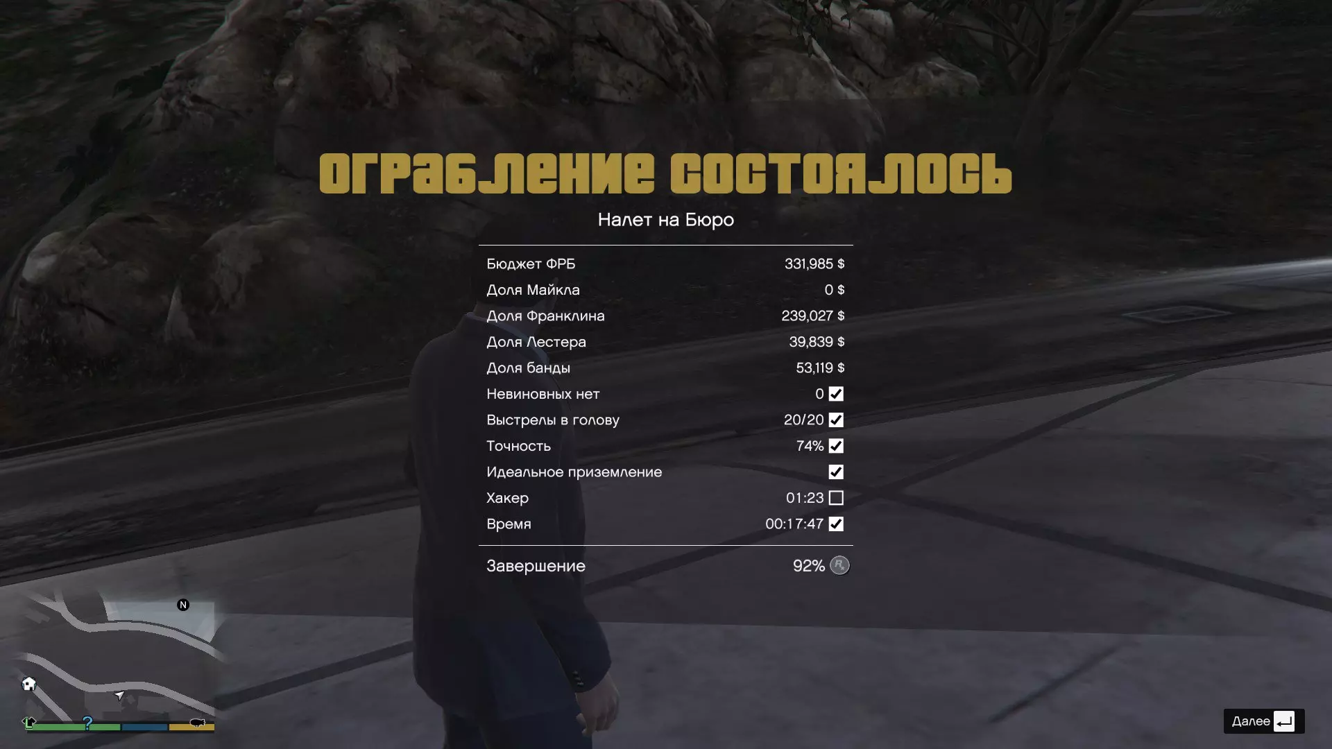 珠宝店抢劫 抢劫成员: 1. 卡里姆·登茨 - 司机【8%】 2. 帕基·麦克瑞里 - 枪手【12%】 3. 里基·卢肯斯 - 黑客【4%】 抢劫后,迈克尔将获得:1220000美元,富兰克林将获得:294000美元
