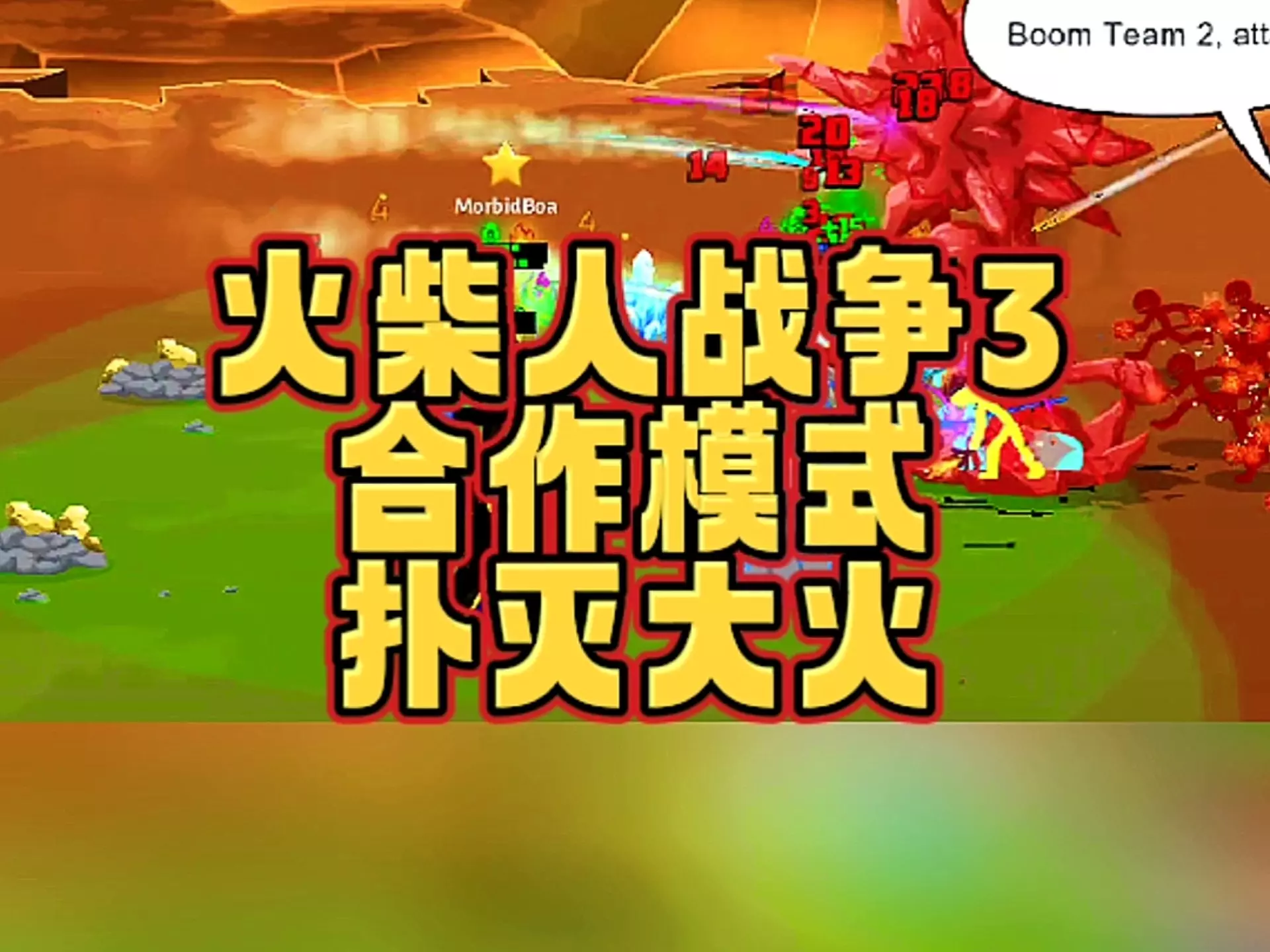 这是一则《火柴人战争3》的游戏内容分享,展示了合作模式里的大规模攻击关卡,玩家可和盟友配合,先让盟友释放毒雨削弱敌人,再释放暴风雪并全军出击,应对敌人的海量剑士冲锋。
