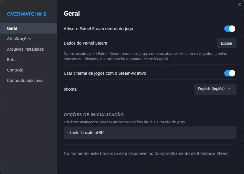 在“属性”窗口的“常规”选项卡中: 在“语言”部分,选择“English (Inglês)”。 (此选项用于设置音频偏好。) 在“启动选项”栏中,输入以下命令: --tank_Locale ptBR (此命令用于设置文本语言。)