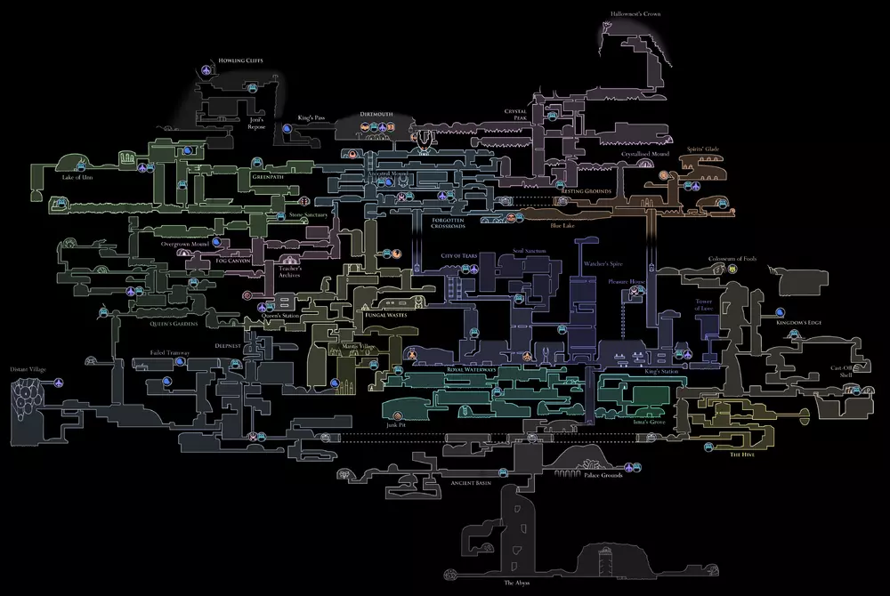 本指南简要概述了《空洞骑士:虚空之心版》(基础游戏+DLC)的所有区域。通过描述和非常精确的地图,即使是新手也应该能够轻松导航,不会遗漏任何内容。 《空洞骑士》是Team Cherry于2017年发行的类银河战士恶魔城游戏,以令人惊叹的氛围和美丽的画面著称。此外,它还拥有一个非常有趣的故事,你将以一只虫子的身份体验这个故事。 概况 在圣巢有很多值得探索的地方:大量的收集物品、不同的区域、NPC以及各种各样的敌人。不过本指南将介绍圣徒之巢的基本区域! 圣徒之巢共有15个地点可供探索: