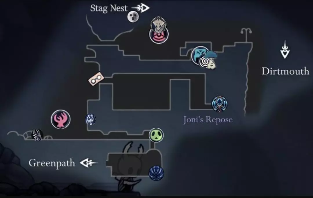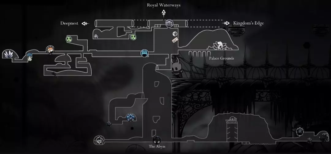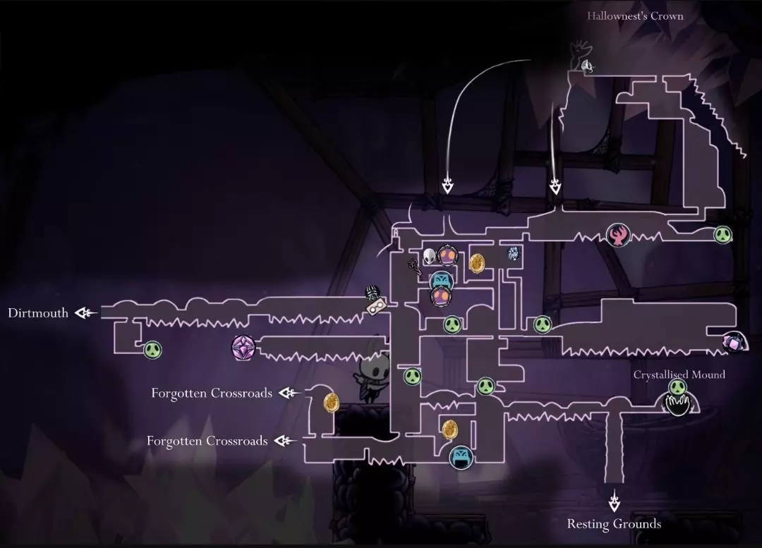 永恒安息之地(Resting Grounds) 通过水晶山峰和泪水之城的特殊路径,你最终会来到永恒安息之地。这个区域有许多新物品、能力,你还会遇到一个特殊的NPC。 在这里你可以获得关于三位梦境者、梦之钉的信息,并且有机会与你的第一个战士之梦战斗。