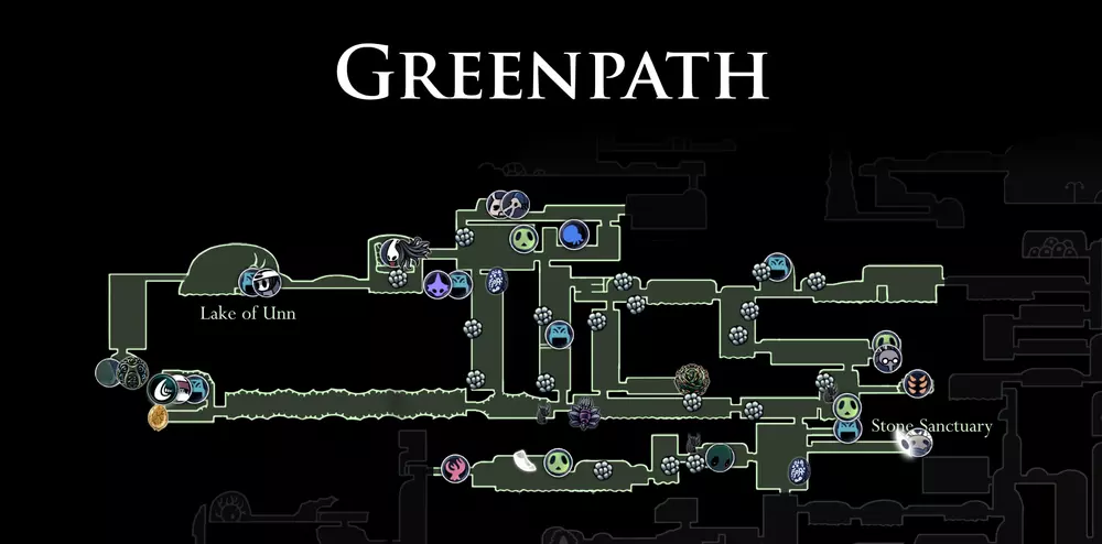 格林小径(Greenpath) 格林小径是一个充满生机的区域,其中包含了森林的诸多危险。这里不仅隐藏着狡猾的草丛和食肉植物,还有巨大的苔藓生物。