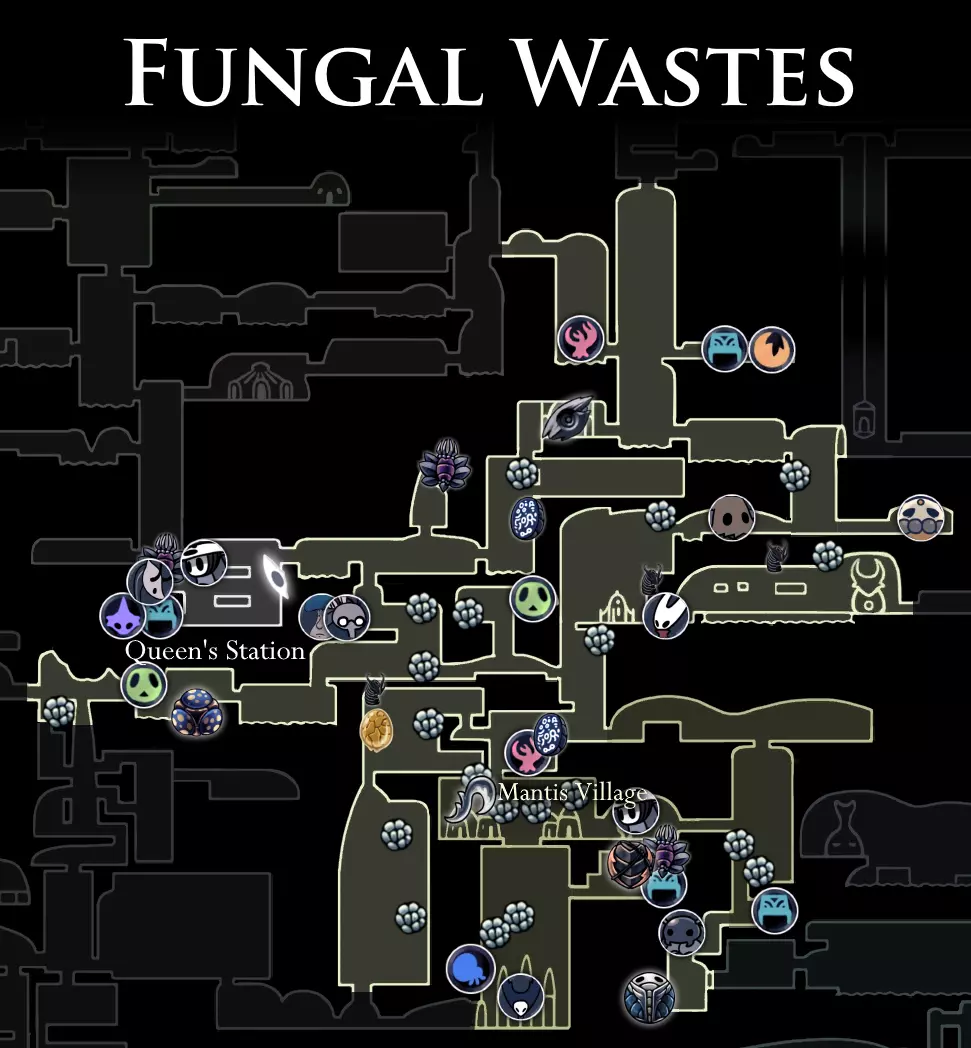 真菌荒地(Fungal Wastes) 真菌荒地是一个非常广阔且延伸极广的区域,这里有许多不同的敌人。此外,在这里还可以收集到一些新的收集品和护符,以及一种前所未见的能力。 由于这个区域的规模,你会遇到各种各样的NPC。
