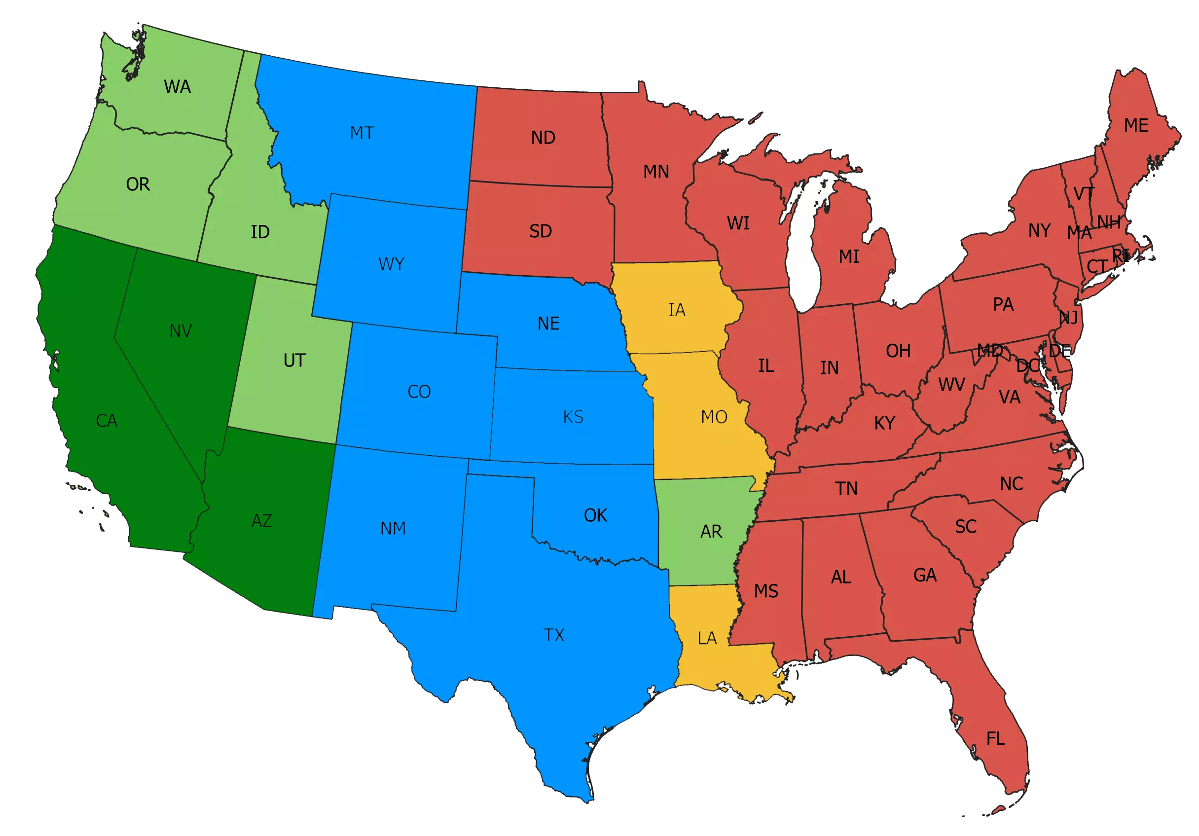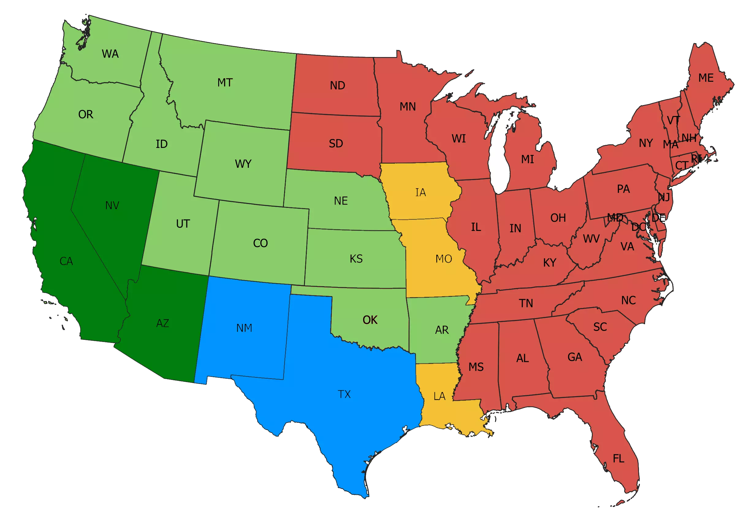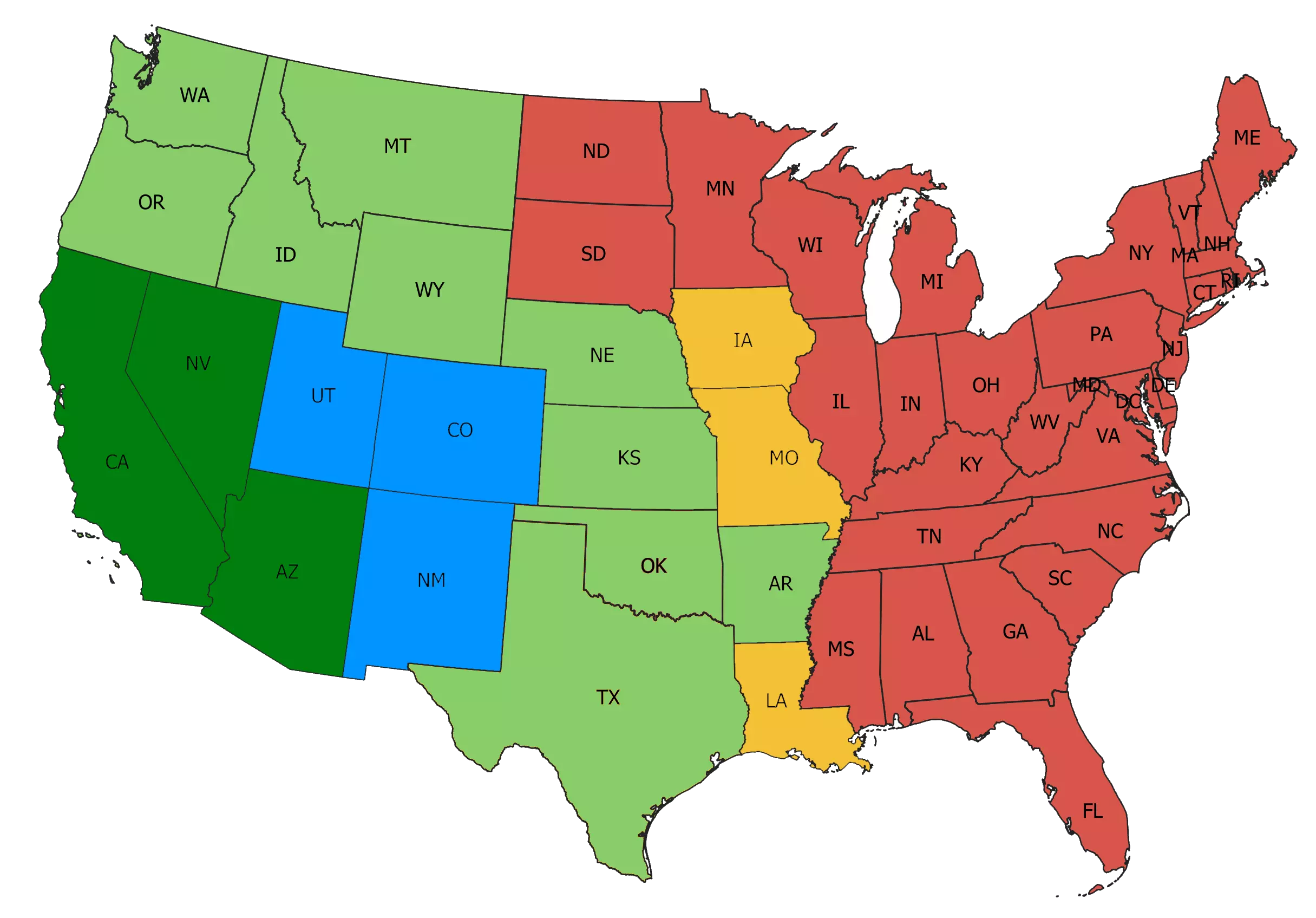 深绿色 - 基础游戏及免费扩展内容。绿色 - 用于扩展地图的付费附加内容。蓝色 - 包含在捆绑包中的州。橙色 - 尚未发布仍在开发中的州