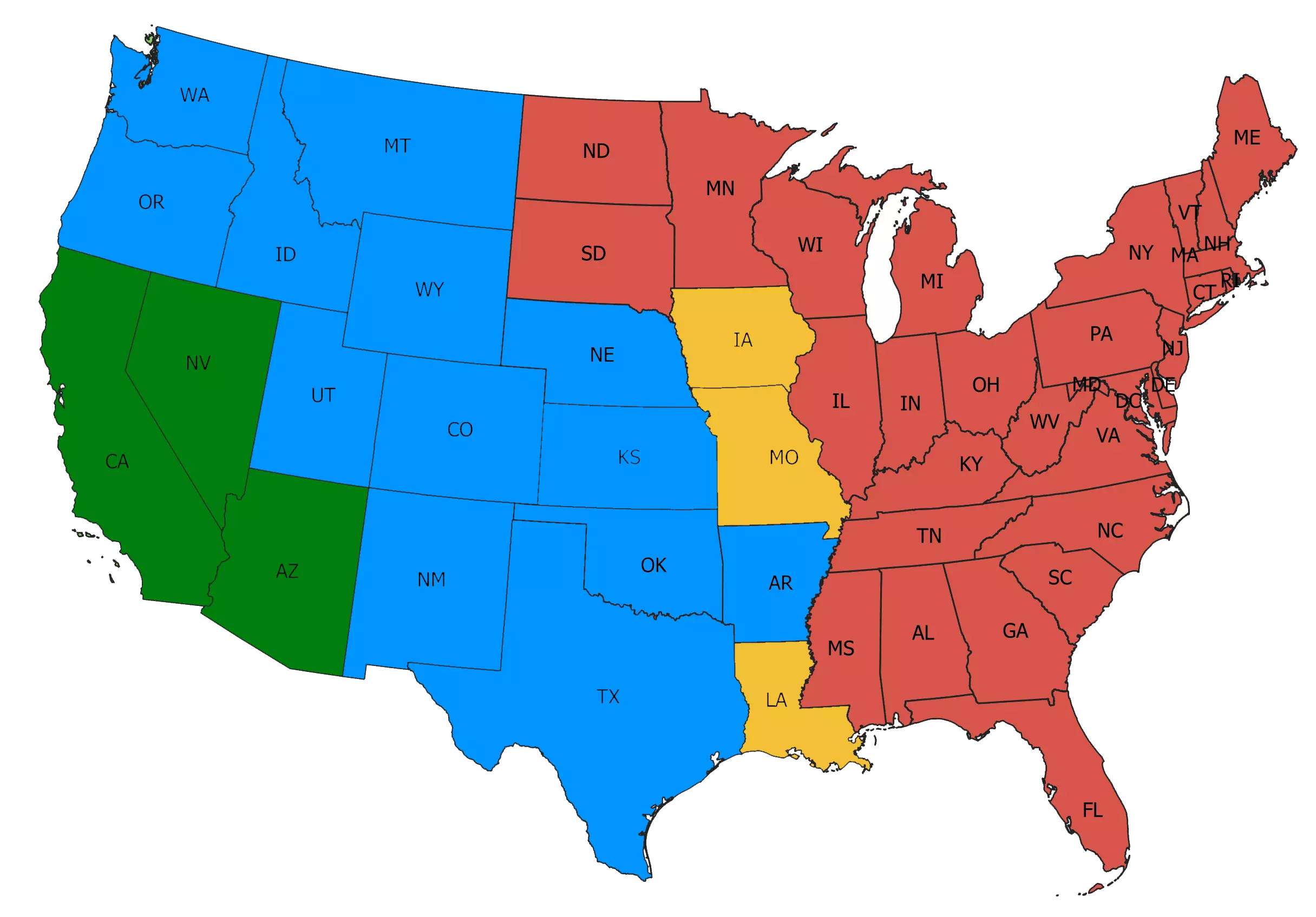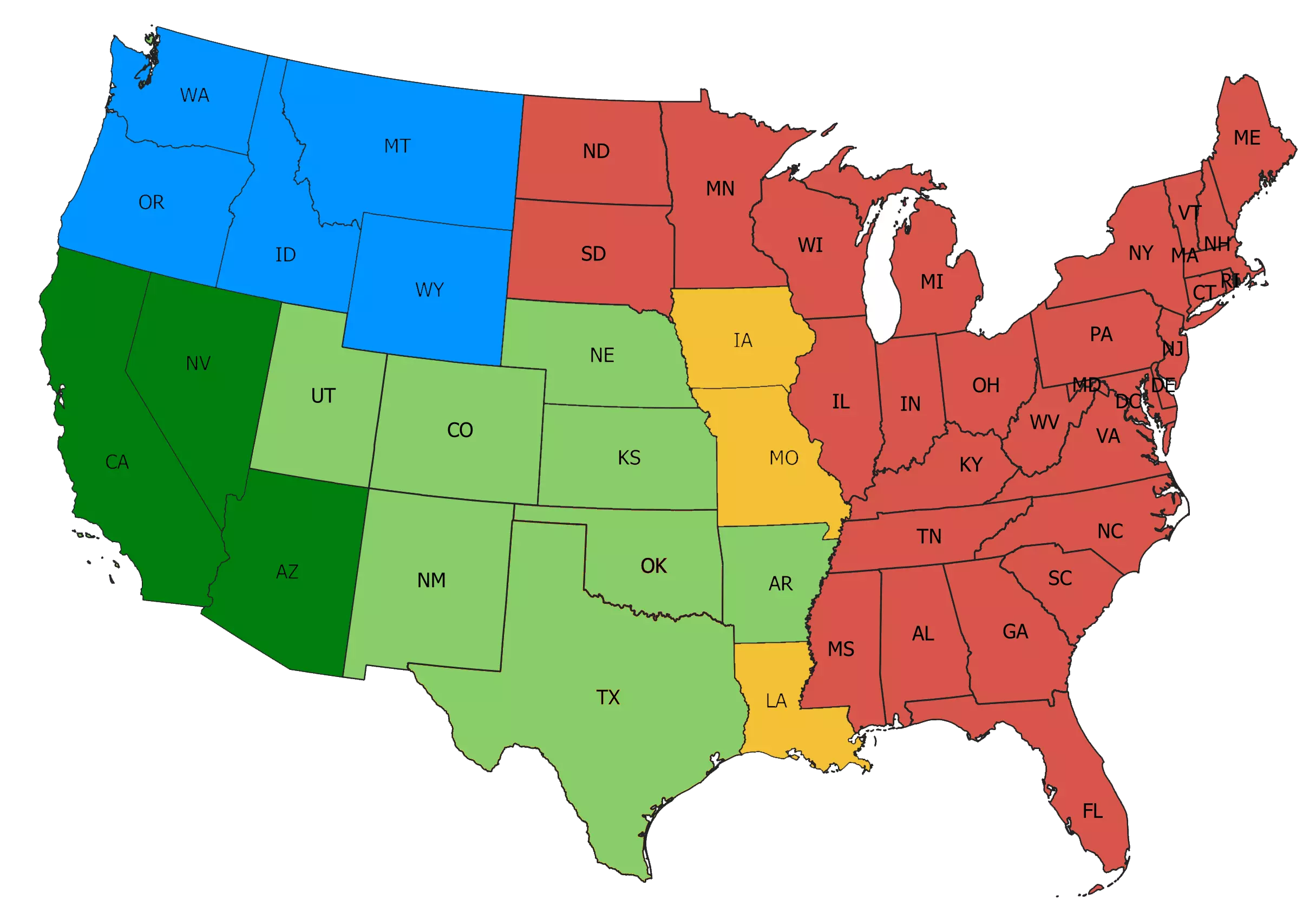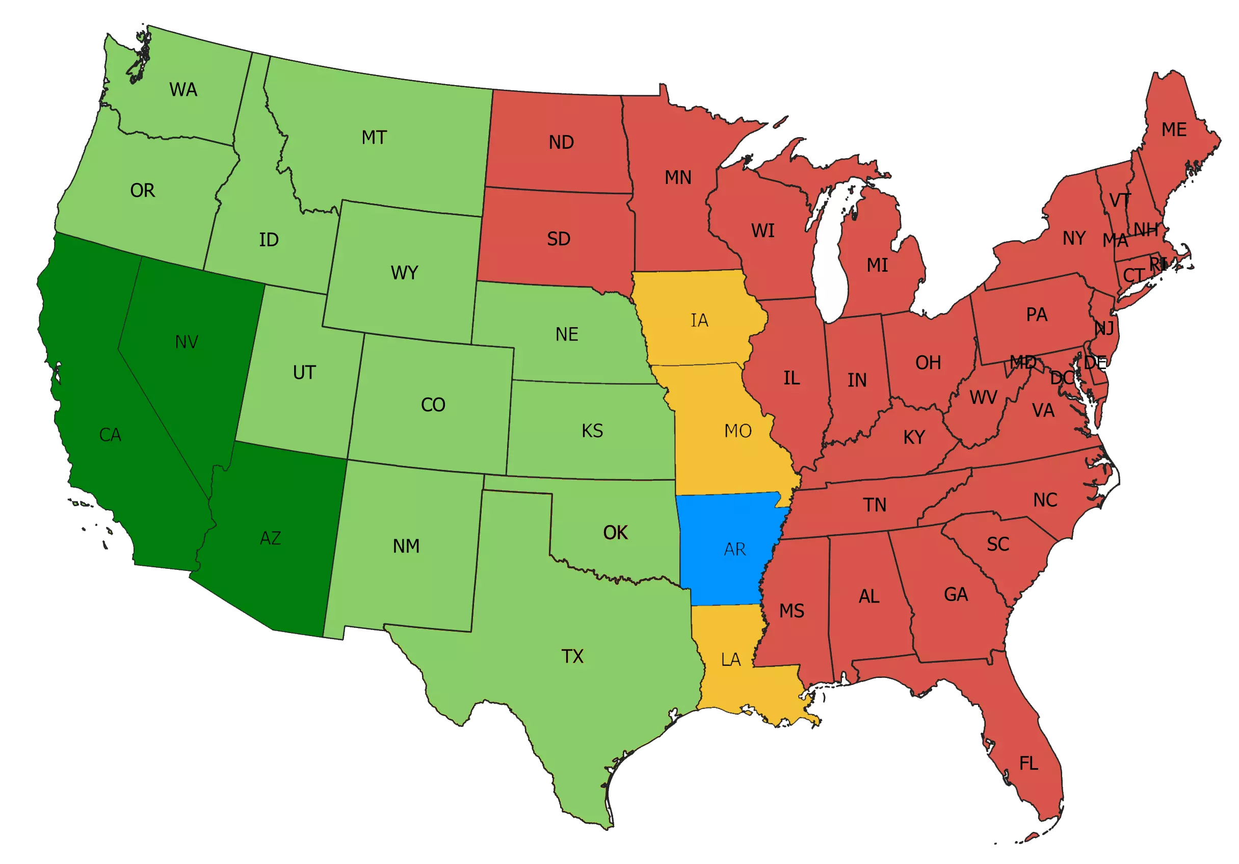 深绿色 - 基础游戏及免费扩展内容。绿色 - 用于扩展地图的付费附加内容。蓝色 - 包含在捆绑包中的州。橙色 - 尚未发布仍在开发中的州