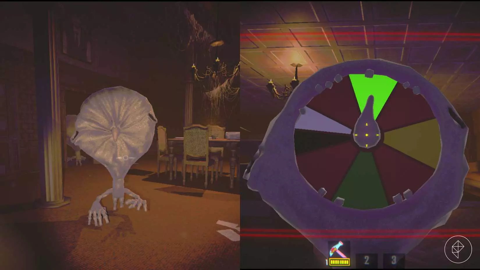 描述 这是一只穿着厨师服、戴着厨师帽的蟾蜍。 属性 - 生命值:150 - 伤害:每击10点 - 举起所需力量:9 - 击晕后举起所需力量:1 行为 它会跳跃移动,直到发现玩家。然后它会短暂停下,微笑着拿出两把切肉刀,接着翻滚着冲向玩家进行劈砍。 战术 厨师总是直线攻击,这意味着只要稍加练习,通过蹲下或向旁边迈一步就能轻松躲避它的攻击。 此时,你可以背对着一个坑,轻松快速地将其击杀,甚至可以用这种方式让它攻击其他怪物。 但要注意,它很容易发现躲在家具下面的玩家。隐藏者(隐形人) 描述 由于它是隐形的,所以没人知道它长什么样。 属性 - 生命值:100 - 伤害:0 - 抬起所需力量:4 - 击晕后抬起所需力量:0 行为 当它发现玩家时,会在玩家面前静止一秒,然后抓住玩家并带着玩家跑到另一个地方。之后它会松开玩家,然后跑向别处。 应对策略 单独出现时相对无害,但如果它把你丢在另一个怪物面前或直接丢进坑里,就会迅速变得致命。尽管它处于隐身状态,但一些线索会暴露它的存在:粗重的呼吸并伴有小团蒸汽,地面上的脚印以及指示其移动方向的烟雾痕迹。 如果你大致知道它的位置,可以用任何物品将其击晕,一旦找到它就很容易将其击杀。 多人游戏时,可以救下被它抓走的玩家,阻止它将玩家带往远处。 领结(告密者)