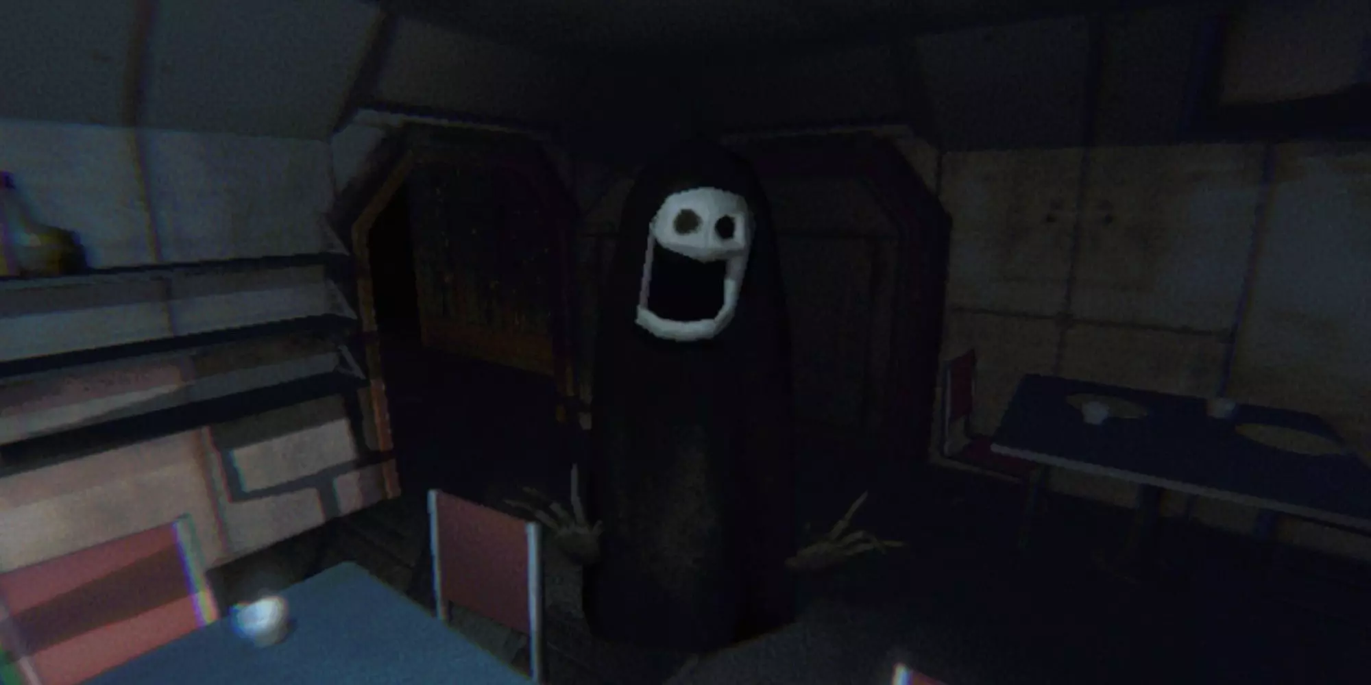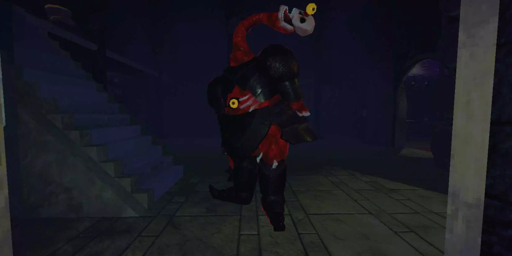 描述 这是一套巨大的黑色盔甲,由一团红色的无定形物质穿戴。它的腹部位置有一只眼睛,另一只眼睛则位于头部,头部通过一根很长的脖子垂下来。它身后拖着一大团物质。 属性 - 生命值:500 - 伤害:重击100/吸气100/撕咬35 - 举起所需力量:13 - 击晕状态下举起所需力量:1 行为 它移动非常缓慢,甚至比蹲下的玩家还要慢。它身后拖着的物质在地面上拖动时会发出独特的声音。当它发现玩家时,会尝试靠近到足够近的距离进行攻击。它会先挥舞一次重击,然后吸气前方区域,对吸入的所有目标造成伤害。战术 它移动速度较慢,因此相当容易躲避,而且移动时持续发出的声音总能提醒你它就在附近。 不过仍需注意,它很难被击杀,因为拥有大量生命值,并且是游戏中唯一能在连续攻击时造成近200点瞬时伤害的怪物。 它的视野范围出奇地低,这可能导致它在距离较远时发现躲在家具下方的玩家。此时它会用头部撕咬来攻击玩家。 清理小队(那些面孔)