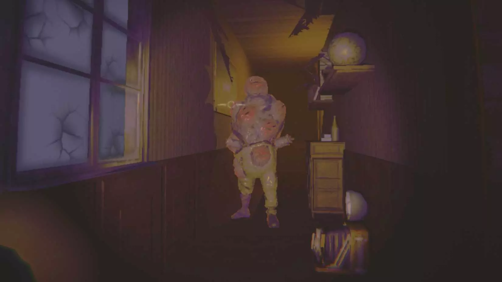 外观上是游戏中最令人毛骨悚然的。与“长袍怪”相似,但有着一张堪比恐怖电影的扭曲面孔。 属性 - 生命值:500 - 伤害:100 - 抬起所需力量:13 - 击晕后抬起所需力量:1 行为 在关卡开始时以及每次重新出现时,它会标记一名玩家。该玩家会看到其双手试图抓住自己的半透明影像,同时伴有心跳声。此时该玩家便知道自己已被它盯上。被盯上的玩家无法躲藏,它总会准确知道其位置。如果另一名玩家在其路径上停留片刻,它会更换目标。一旦玩家进入其攻击范围,它就会用双手将其夹击。战术 它显然是游戏中最难躲避的怪物。不过,通过在地图上绕圈,你可以逃跑足够长的时间,直到它厌倦并离开。 最好的解决办法仍然是杀死它,尽管它有500点生命值和毁灭性的攻击,这并不容易。远程武器仍然是最可靠的选择。
