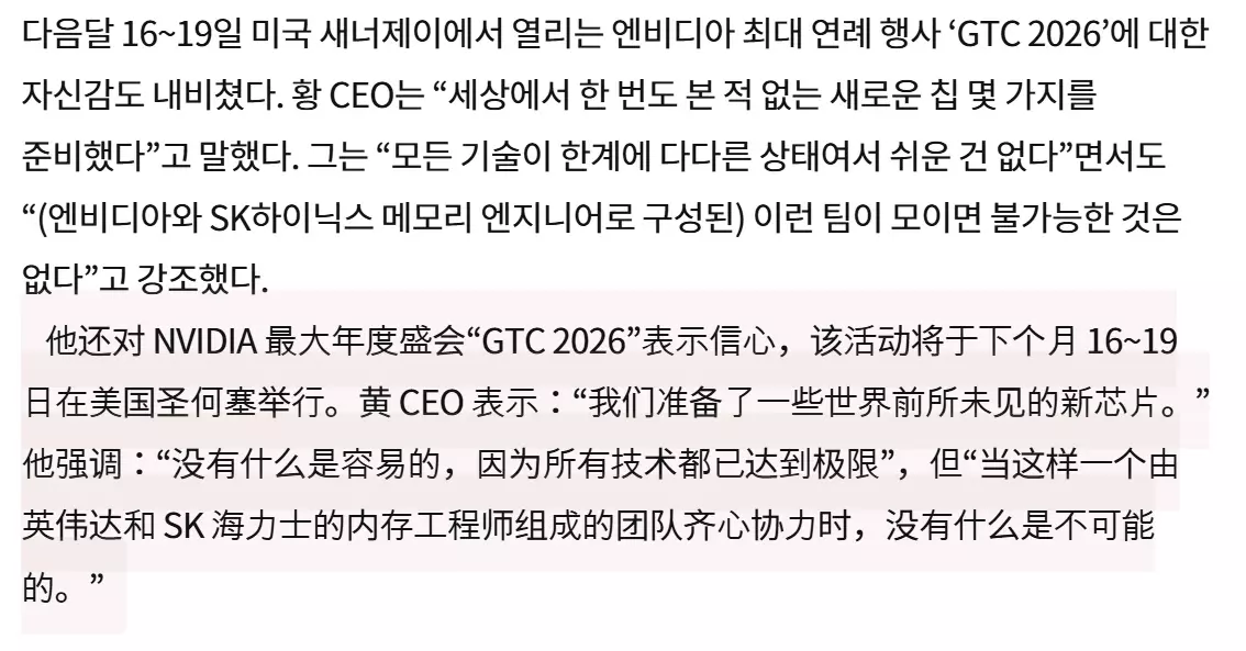 Reddit上关于英伟达重大发布的推测已全面展开。许多用户认为即将推出的维拉·鲁宾架构是最可能的候选方案。在接受《韩国经济日报》采访前夕,黄仁勋会见了韩国存储芯片制造商SK海力士代表。他将此次会面描述为"与世界领先存储半导体团队的庆功晚宴"。SK海力士是高带宽内存(HBM)的主要生产商之一,目前正积极推进HBM4研发。极高的内存带宽与低延迟对数据中心AI加速器至关重要,这使得先进HBM技术成为下一代AI硬件的关键因素。