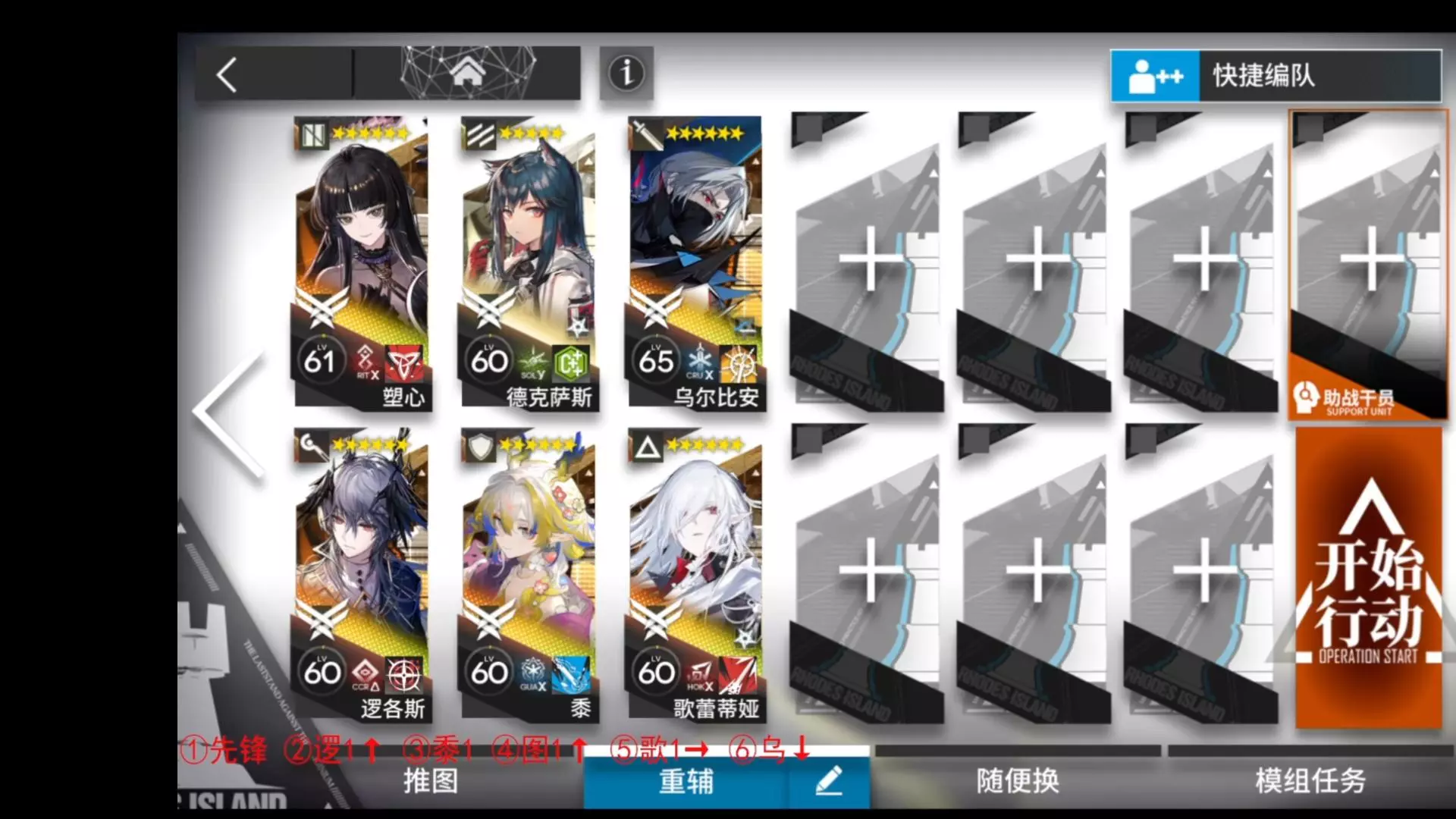 干员均专三60级带1级模组,逻各斯3级Δ模组,维什戴尔3级X模组,歌蒂3级X模组(给乌尔比安减伤回血,很重要) 本视频为为懒人向挂机流攻略,不排斥手动开启的技能但少用,视频里大多数情况都是携带挂机技能的快速摆完的打法,少部分难打的关卡会选择简单好抄的手动打法,用一些决战技等手动技能,非低配攻略。 视频里常用的干员及技能: ps:视频绝大多数情况都是用的都是永续/点燃/强力击类的挂机技能,手动技能用的非常少,但用的手动技能基本都是可汗玩家很常用的技能,标记出来方便大家专精 【先锋】桃金娘1(多数情况下可以用异格银灰1替代,银灰回费更快还不用开技能)、德克萨斯1、推进之王2、风笛2、伊内斯123 【近卫】拉普兰德2、山2、煌2、重岳3、棘刺3、玛恩纳3、史尔特尔3、锏3、乌尔比安2、怒潮凛冬2 【重装】临光1/谷米1/黍1/塞雷娅12(视频里用塞雷娅1技能的情况黍1技能绝大部分情况都能替换,现在视频里塞雷娅用2,黍1替换塞雷娅1,更方便大家看技能,省去塞雷娅换技能的时间。一般情况塞1可以替换黍1,少数情况多加个奶也能替换)、星熊2(建议开X模组加防御,平替2级X模组年,下位蛇屠箱或者泡泡开X模组多数情况开开技能也能替换)、泥岩2、号角1、斩业星熊12 【狙击】能天使3、提丰2、维什戴尔13、水陈3、蕾缪安1、娜仁图亚1 【术士】澄闪23、艾雅法拉23、伊芙利特2、逻各斯13、小刻2、林13、异格拉狗1、初雪2 【医疗】纯烬艾雅法拉13、夜莺23、白面鸮2、苇草3、闪灵2、华法林12、流明13(视频里纯奶绝大多数情况都可以用纯烬艾雅法拉1替换)、M3 【辅助】铃兰23、塑心1、浊心斯卡蒂2、灵知1、酒神1、遥2 【特种】水月1、伊桑1、阿斯卡纶1(地刺干员基本99%情况可以无脑用阿斯卡伦替代)、歌蕾蒂娅1(3级模组)、缄默德克萨斯3、麒麟R夜刀23、温蒂2、老鲤3、新能1 用到的干员不止以上这些干员,一些特殊关卡会用奇奇怪怪的干员。 视频里的主力干员基本专三技能等级,一些没有什么专精收益的默认7级 默认带模组,建议常用干员都开个1级,提升很大,如果需要带模组的时候默认1级模组。
