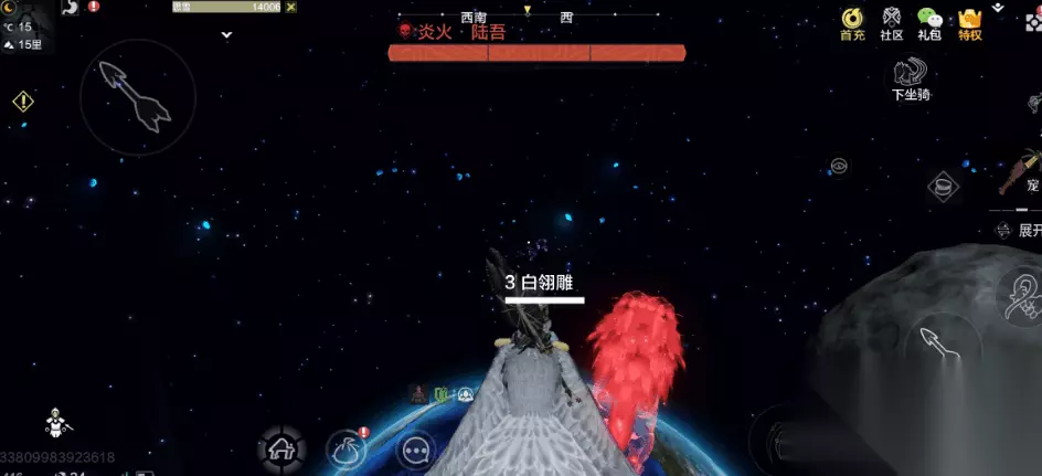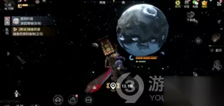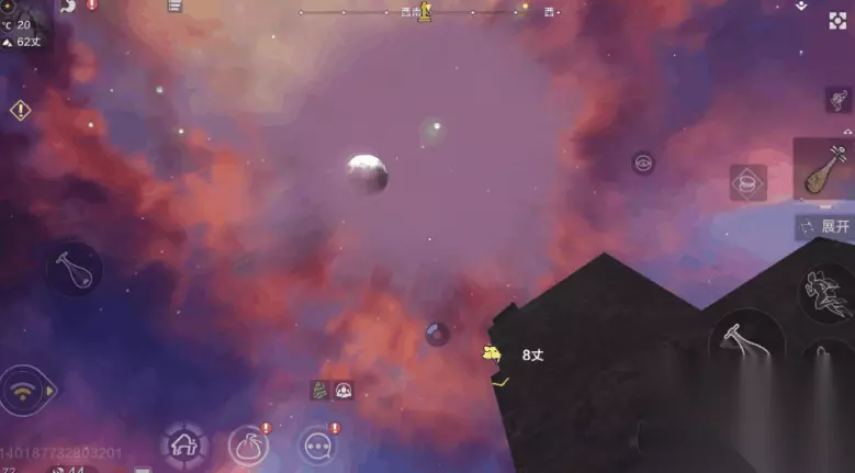 3、在飞行的过程当中火箭会消失的,不知道是不是燃料不够,还是因为什么样的原因,这个时候就需要各位去召唤一下飞行宠物,然后飞到这个蓝色星球比较密集的位置就可以了。 4、在巨大的白色星球上面就可以直接来到云端,在这里就可以跟岳云鲲 NPC直接对话,然后使用相应的材料净化就可以了。