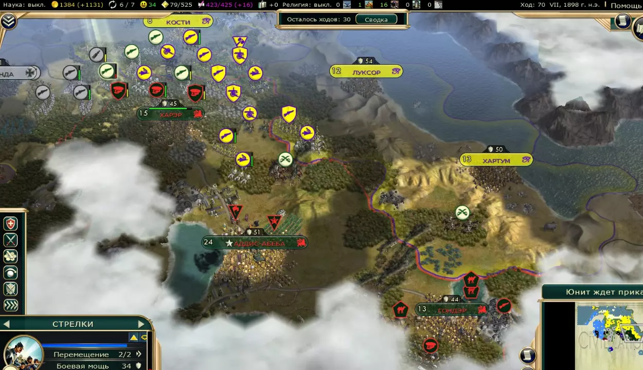 一般来说,在舰队开始“自我扩张”后,就需要将城市的发展重点集中在黄金上。占领上述城市后,要与所有愿意和谈的国家缔结和平条约,同时要求对方提供尽可能多的黄金/回合。 另外,占领里斯本后,我立即将直布罗陀和里斯本两座城市卖给了埃及,以换取黄金/回合。为了让自己的电力值(ОП)获得更大增长,同时减少埃及的电力值增长(尽管埃及是盟友,但在剧情中也是竞争对手)。阿尔及利亚可以先保留并发展,它最多能带来约85金币/回合的收益,之后最好将其卖回给法国以换取金币/回合,因为法国会提供比它带来的收益更高的金币(约200),而且法国之后可能会再次宣战并派步兵进攻阿尔及利亚。第二段(约65-100回合)或“埃塞俄比亚种族灭绝”行动 游戏后半段会发现出现了一位新领袖,其胜利点数增长极快,这种增长趋势即便你每回合拥有大量金币也无法与之抗衡。这位领袖是埃塞俄比亚的,所以在战胜欧洲人之后,用每回合获得的资金(大约一千左右),每回合在的黎波里和班加西各招募一个单位,然后派往埃塞俄比亚的东南方向(至少在我玩的情况下是这样),以消灭埃塞俄比亚。
