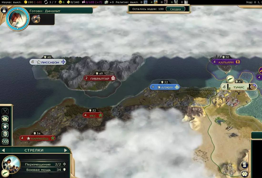 因此,一旦欧洲人发动进攻,就需要将突尼斯卖给埃及!作为交换,购买海军单位。之后,防守剩下的两座城市,直到积蓄足够力量。这里正是我们拥有土耳其的主要王牌——任何海军单位都有一定几率俘获被击败的船只的能力。这是快速扩充军队的方法。一旦力量足够,就攻占意大利的首都巴勒莫以及那里的煤矿。在此之后,意大利就不再是居民了——我们要将其余城市纳入自己的控制之下。至于其他国家,甚至不必担心,它们要么无法触及你,要么初始的那三名士兵就足以用于防御。 之后我们出发(更准确地说是航行)去攻占法国的首都——阿尔及尔、葡萄牙的首都——里斯本、英国的城市直布罗陀,同时快速扩充海军舰队。