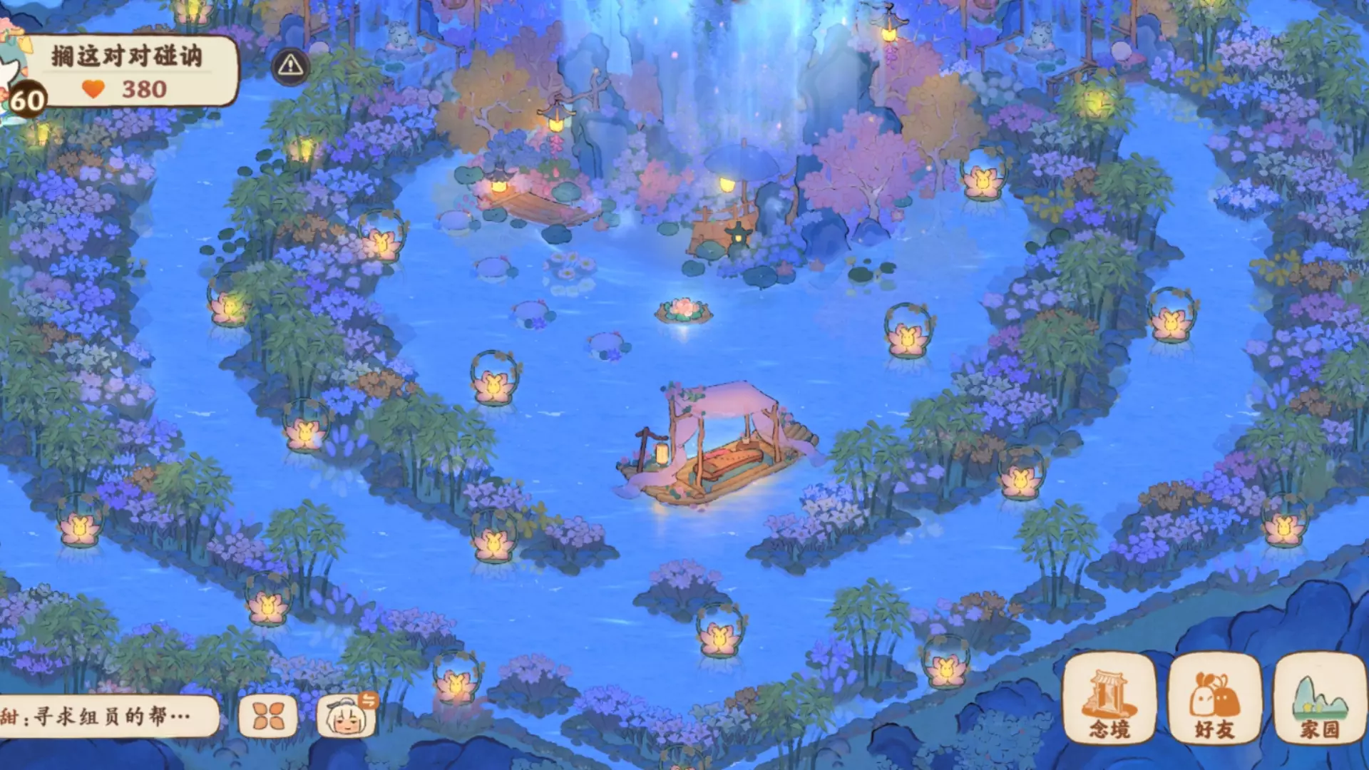 这是游戏《桃源深处有人家》里的新甲璇霄醉舫仙女湖布局,夜晚灯火璀璨,古风建筑环绕水域,还有角色表演、休憩的场景,治愈感拉满,展现了极具氛围感的古风水乡夜景。