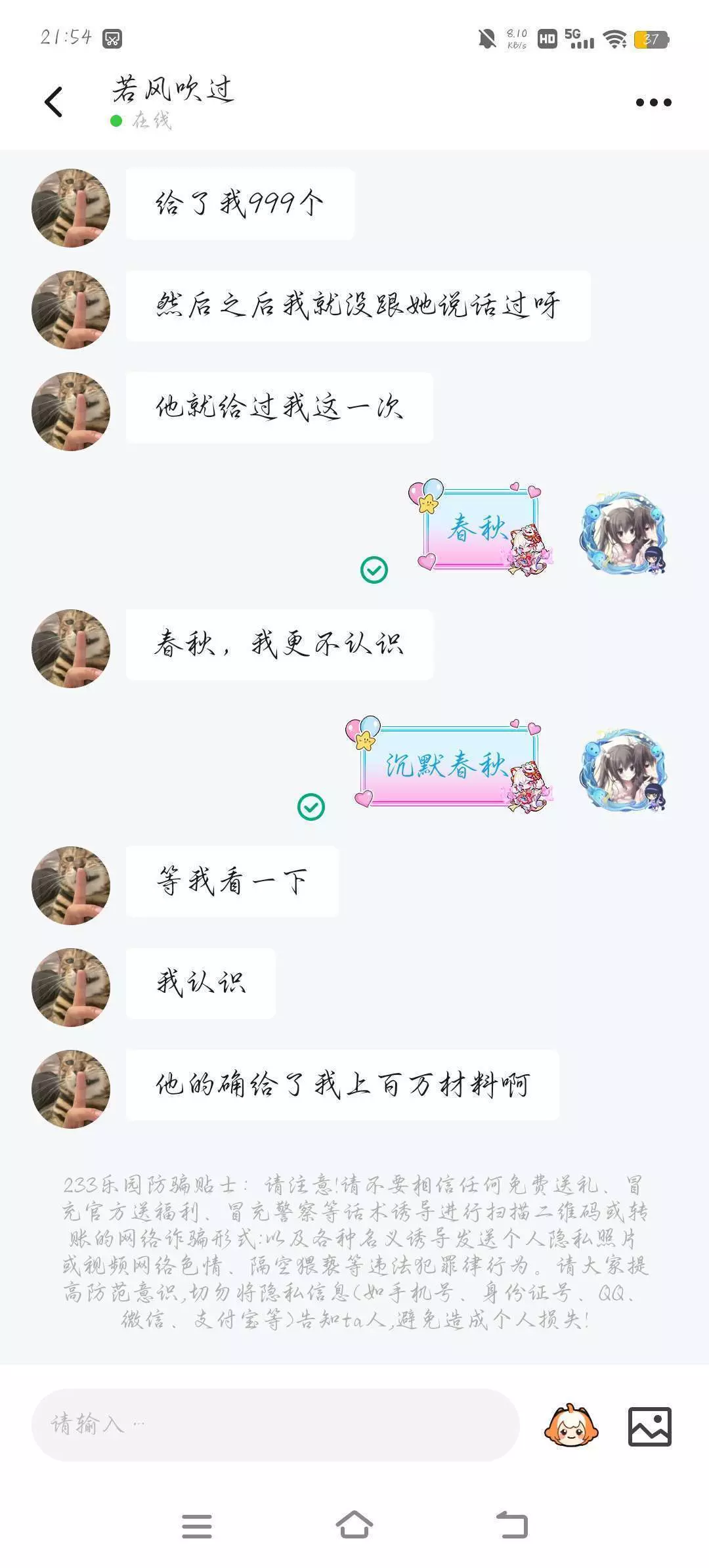 这个是一开始的,它先加我好友,当时还在我们社团里面,找我要材料,我就毫不犹豫给它了,也给了很多,大概有上百万材料。
