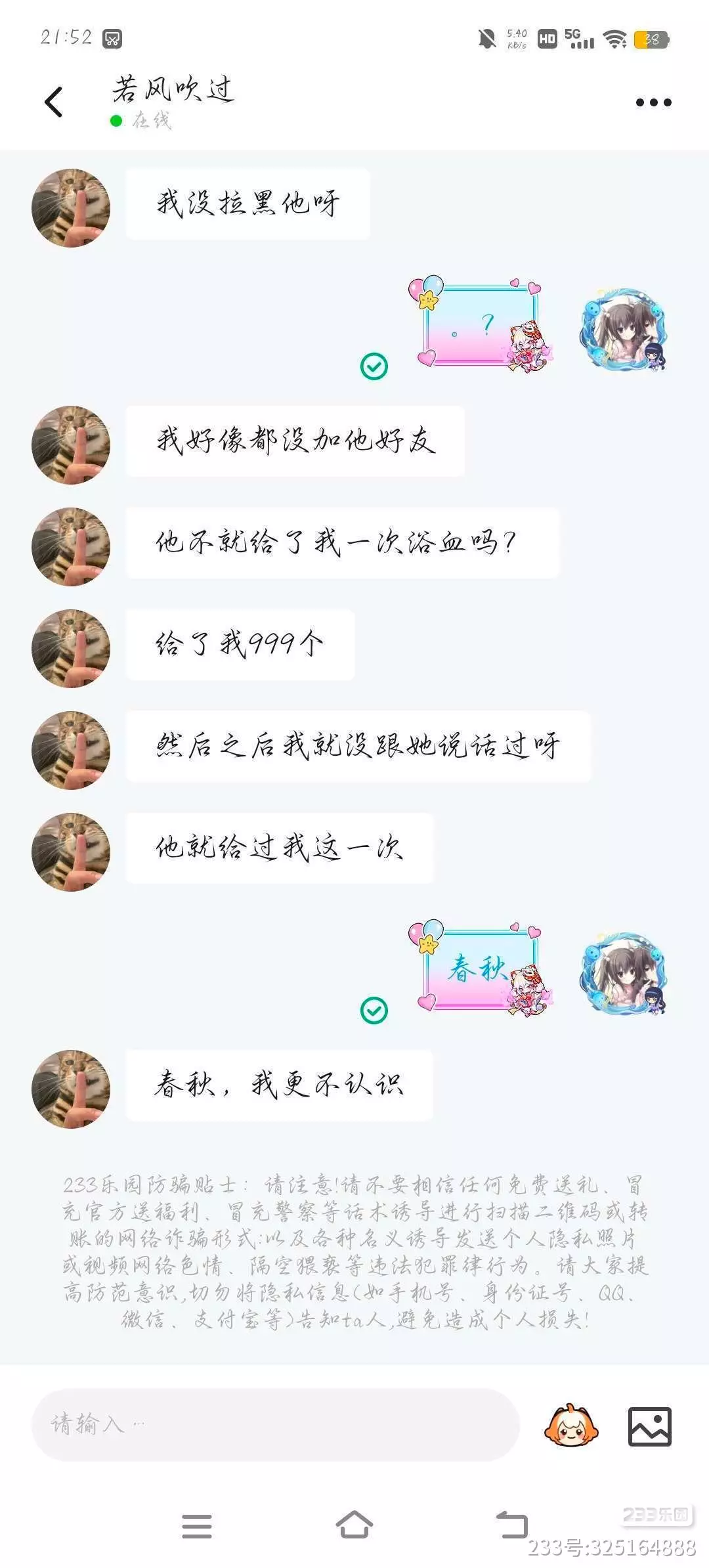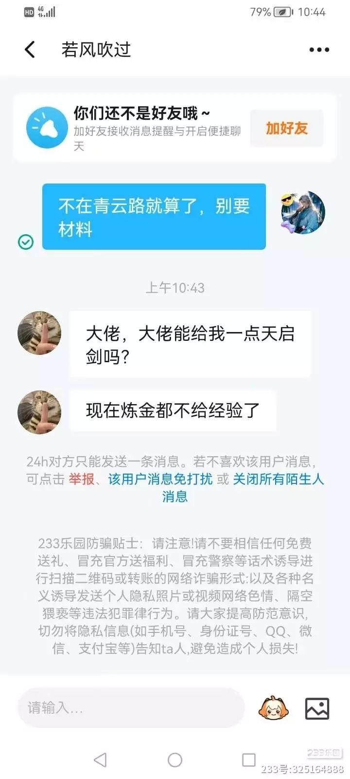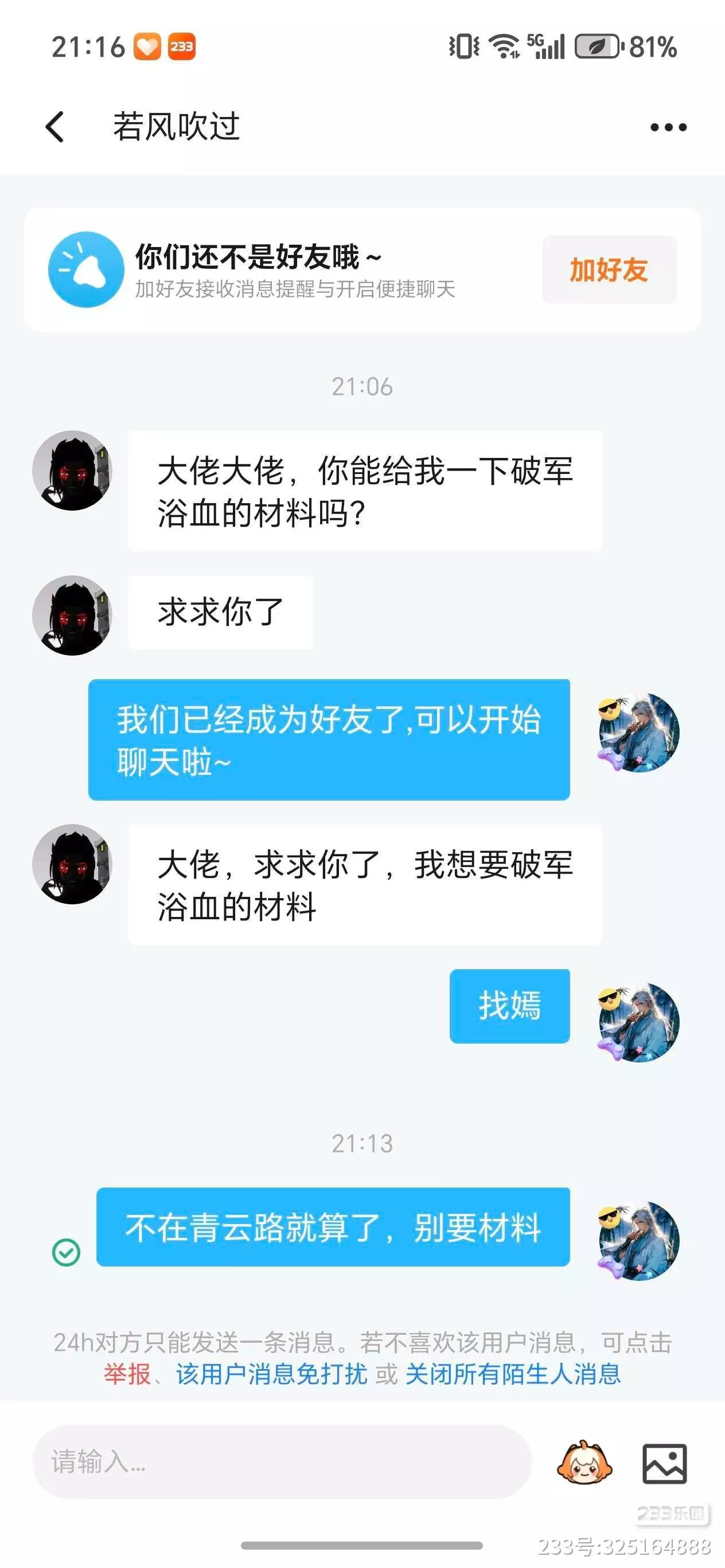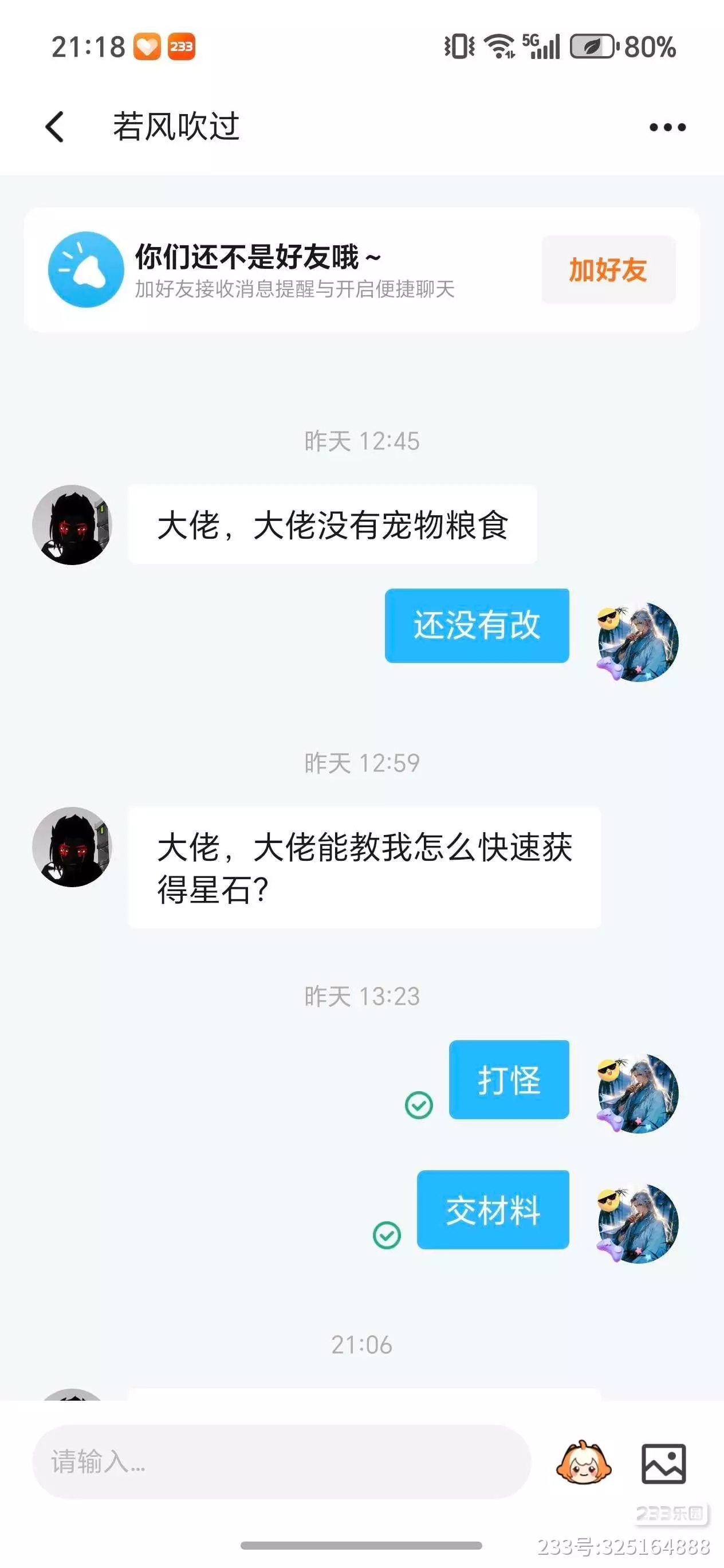 它又加回我好友,然后问我说有没有材料。加为好友,我一开始以为只是出了bug的问题,偶然间没了好友,没多想,我也没有准备好材料,我就找我朋友,让我朋友给它材料。