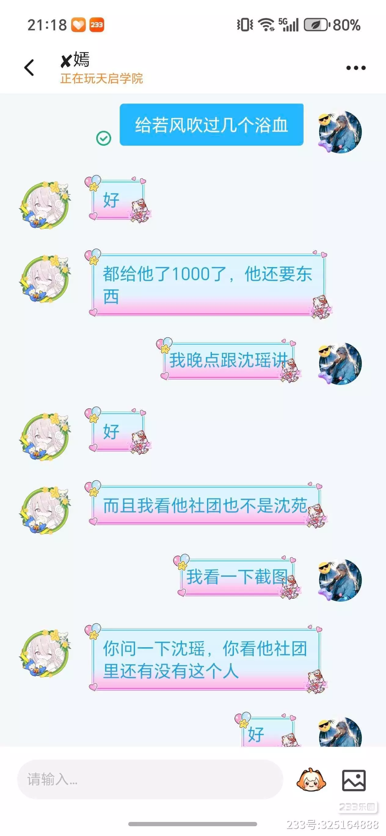 等我跟我朋友 @ん.[嫣] 讲完后,我朋友也毫不犹豫的答应了,可是不到1分钟我朋友就开始吐槽,说他不停地找自己要材料,明明已经把要的给他了,可是他还要,一直得寸进尺,还多要好几种材料。而且随后又跟我讲说,那个人已经退出了我们社团,于是我便回复: