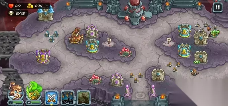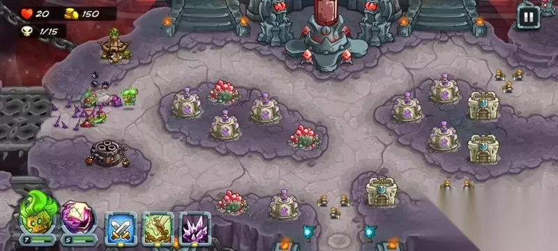 在防御塔布置方面,建议先在左侧入口处建造炮台,这个位置可以同时覆盖上下两条路径。上方入口适合放置弓弩塔,路口中间则推荐修建法师塔。三个主要路口都需要设置兵营来延缓敌人前进速度。随着关卡推进,要及时升级炮台、兵营等作战单位以应对越来越强的敌人。