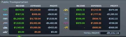 一个将货物运往远方的货运港口。 总结一下,以下是主要要点: - 对于公交车、有轨电车和渡轮:增加设计合理的线路以抵消车辆段成本 - 对于地铁、火车和单轨列车:提高线路的乘客数量 - 对于飞艇和直升机:尝试短距离路线,并在每条线路上配备大量交通工具 - 对于缆车:用缆车替代高密度的步行路线 - 对于出租车:建造足够的车辆段以满足需求,并额外配备几辆出租车,但要注意交通问题! - 对于外部连接:吸引足够多的游客到城市,他们离开时会付费