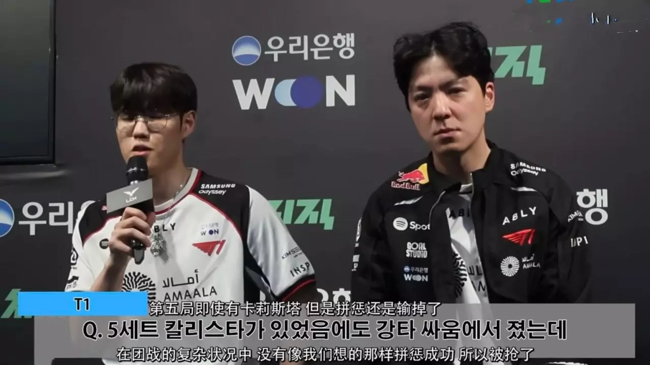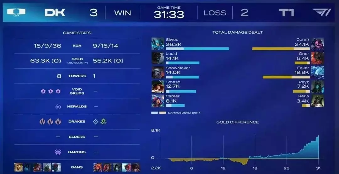 决胜局是最抽象的,多兰为了打对线,放弃传送带点火,结果一点压制力没有,队伍里有卡莉斯塔的情况下,Oner连续被抢两条龙,Peyz龙团和打野没有沟通就算了,对线也没打好,卡烈组合,被妮蔻和女枪压着打,31分钟的比赛,Peyz和Oner两个人,全场输出都没有对面的辅助高。