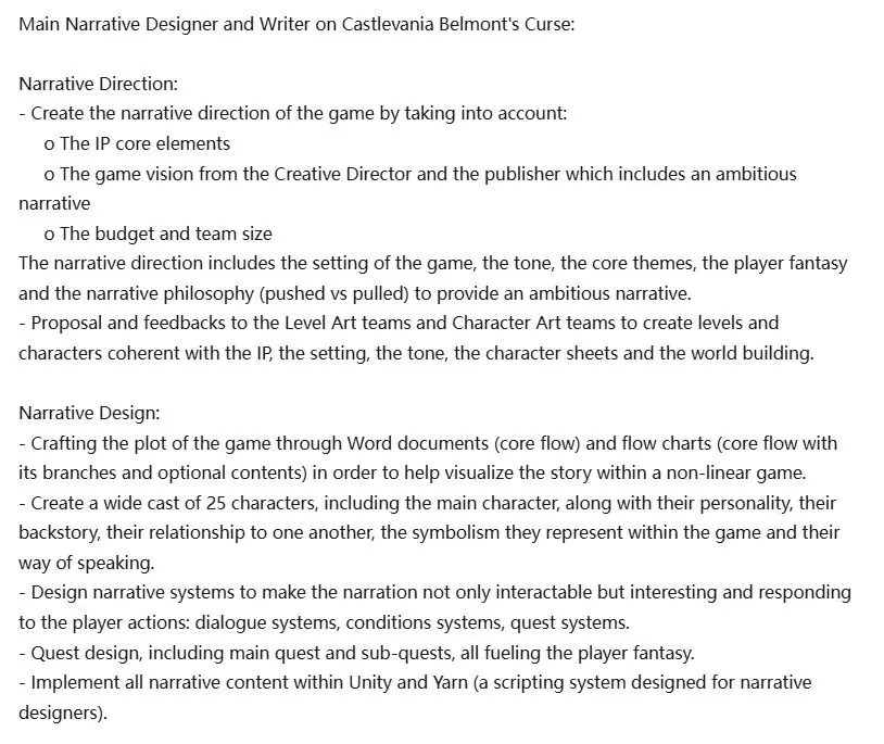 《恶魔城:贝尔蒙特的诅咒》高级叙事设计师兼编剧玛丽·鲁齐(Marie Rouzié)在LinkedIn个人资料中更新了关于游戏叙事方向与设计的详细信息。在随附的帖文中,她透露自己投入近三年时间协助项目落地,并对游戏终于公之于众感到欣喜。“我终于能正式宣布了!”她写道,并表示期待玩家探索团队打造的“精彩叙事架构”。