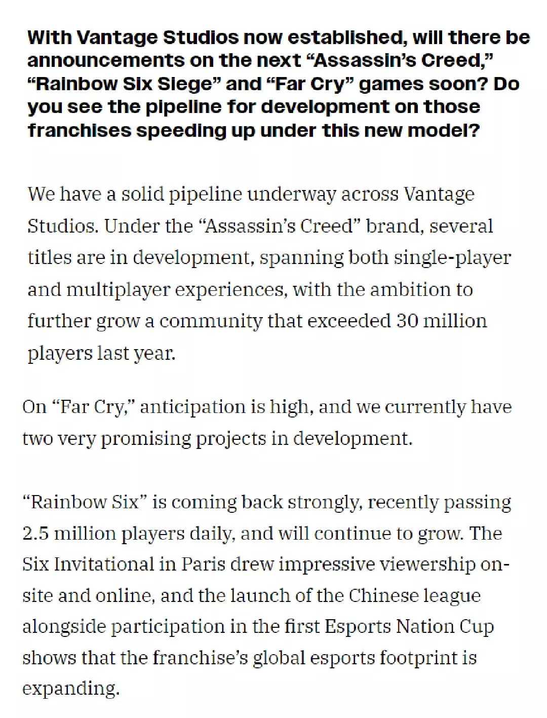 育碧CEO Yves Guillemot在接受Variety采访时表示:“Vantage Studios旗下的各开发团队已建立起稳健的产品线。” “《刺客信条》系列正在开发多款作品,涵盖单人及多人游戏体验,目标是进一步壮大这个去年玩家总数突破3000万的游戏社区。” “《孤岛惊魂》系列也备受期待,我们目前正着手开发两个前景广阔的全新项目。” “《彩虹六号》势头强劲,近期日均玩家数已突破250万,并将继续保持增长。在巴黎举办的国际邀请赛吸引了大量观众,同时,中国联赛的启动以及战队首次参与电竞国家杯,都标志着该系列在全球电竞领域的影响力正在不断扩大。”