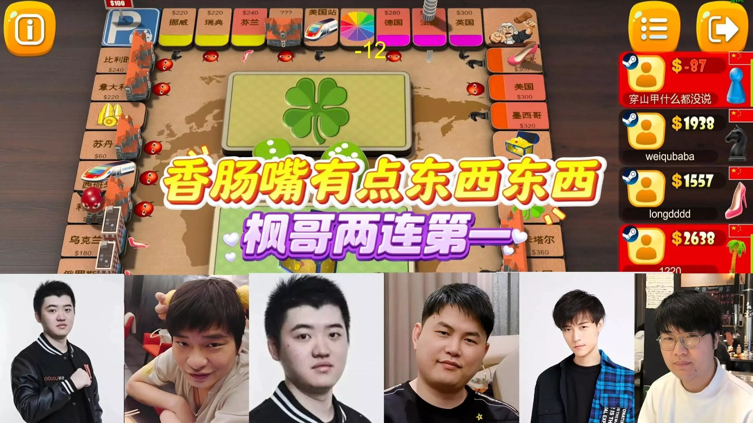 这是一期大富翁G4的游戏对局内容,开局枫哥天胡,对局中出现俄罗斯轮盘、地产竞拍、资产转移、股票出售等经典大富翁玩法,还引发关于长生门是否转衰的讨论。