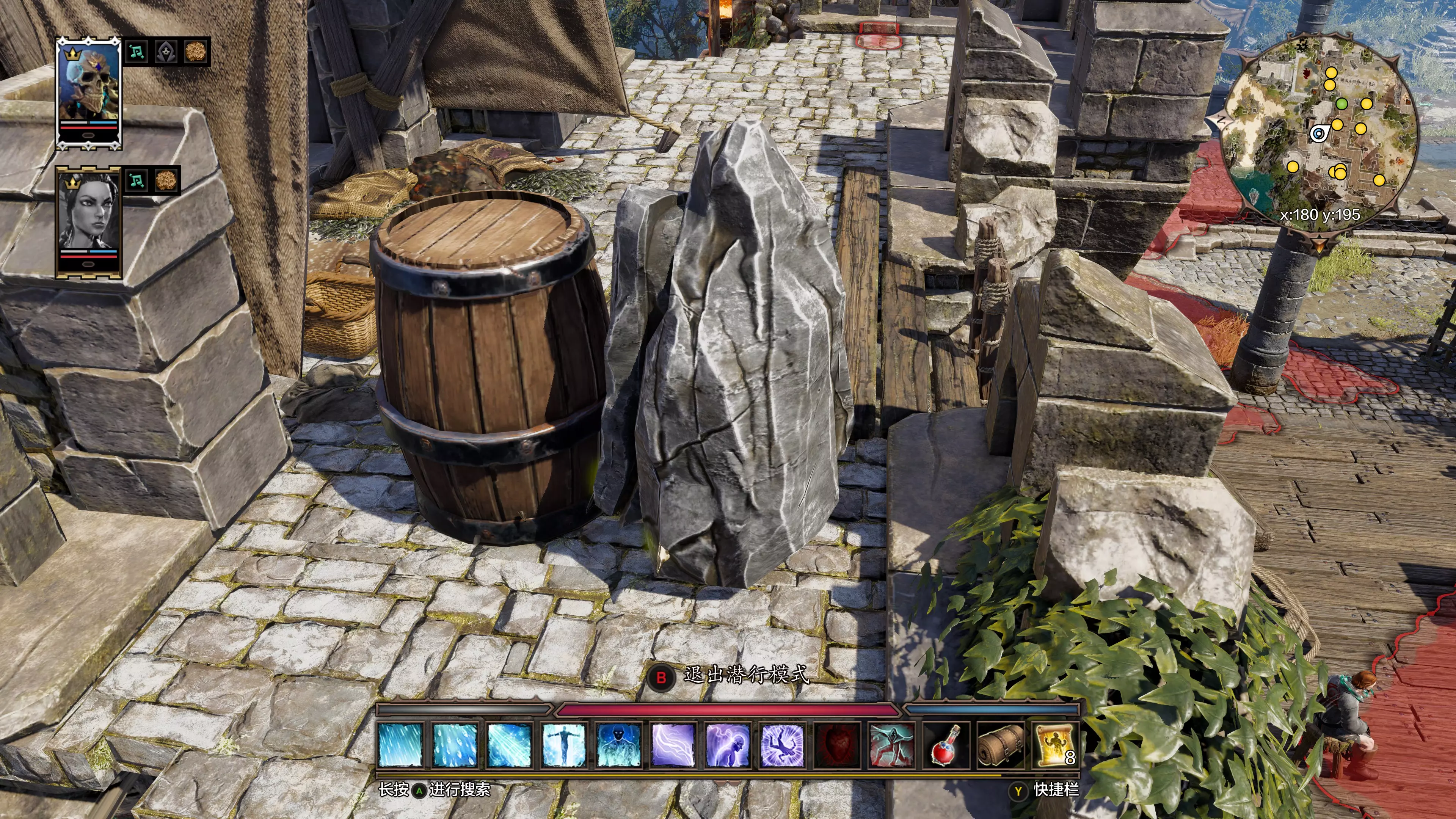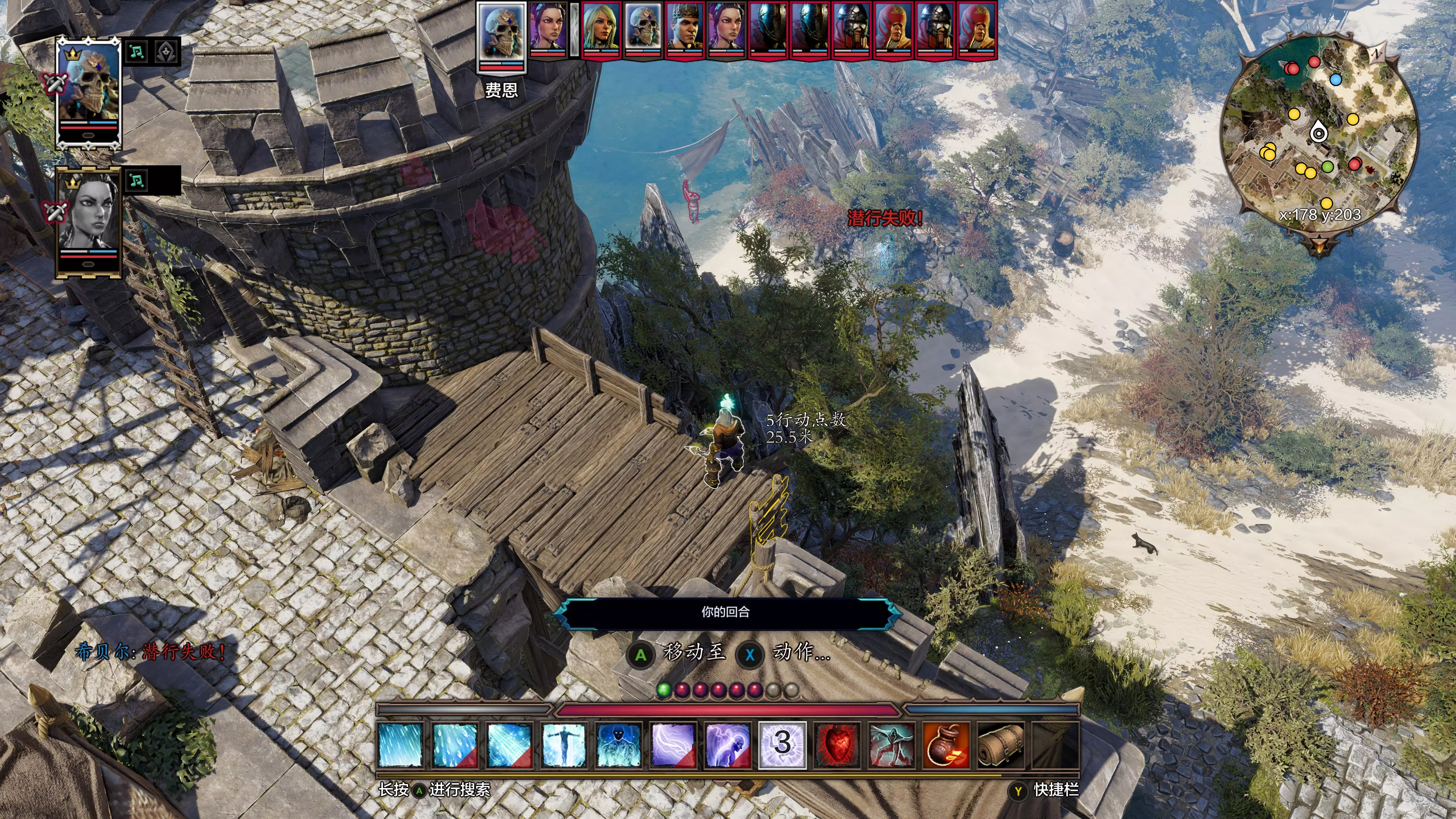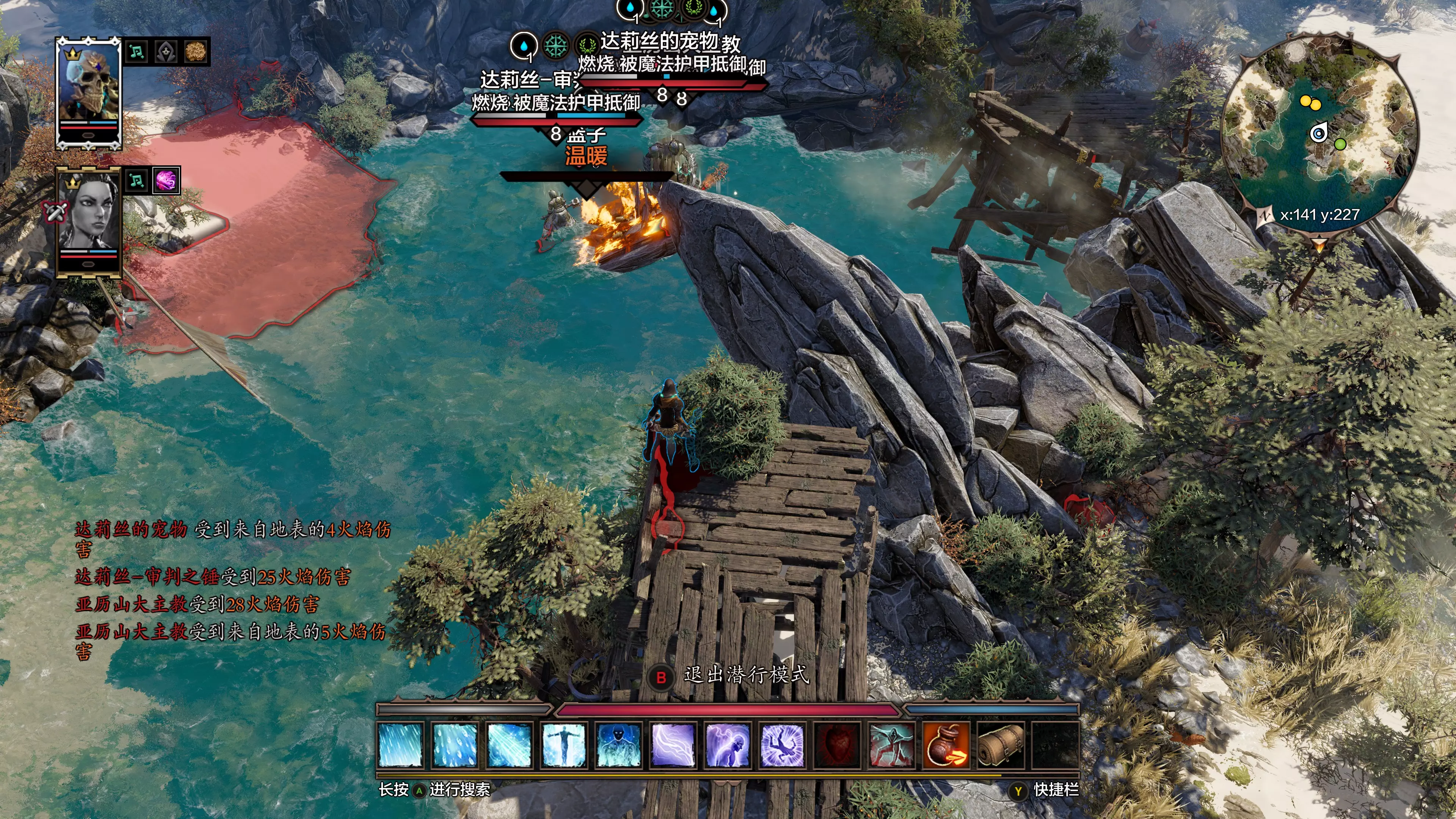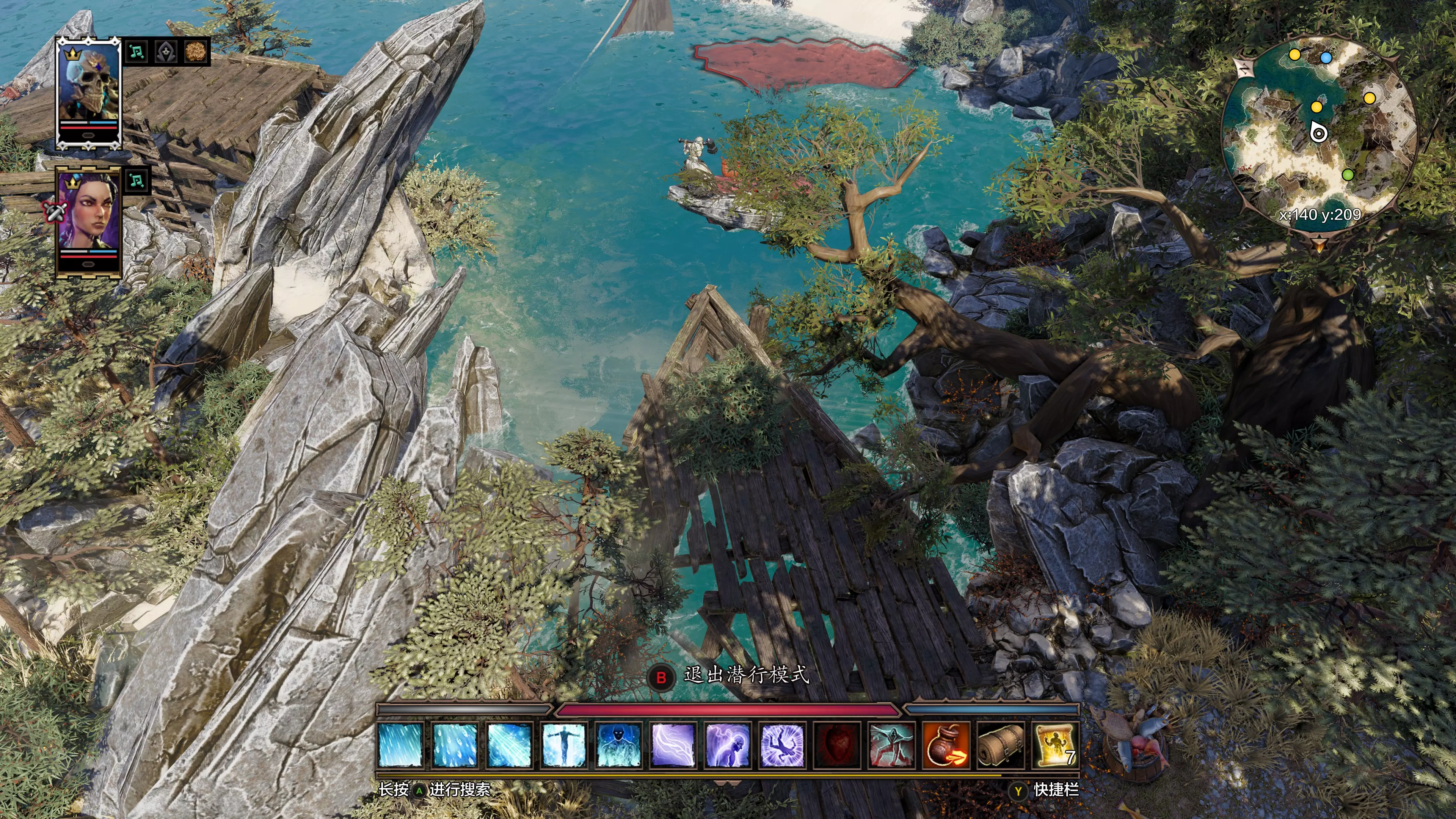第二阶段:刮痧轮转击杀 1. A脱离战斗后穿越欢乐堡,绕行至鳄鱼区域的木质甲板上(坐标约X 129,Y 232)并潜行,从安全区域远程攻击达莉丝,再次触发战斗。