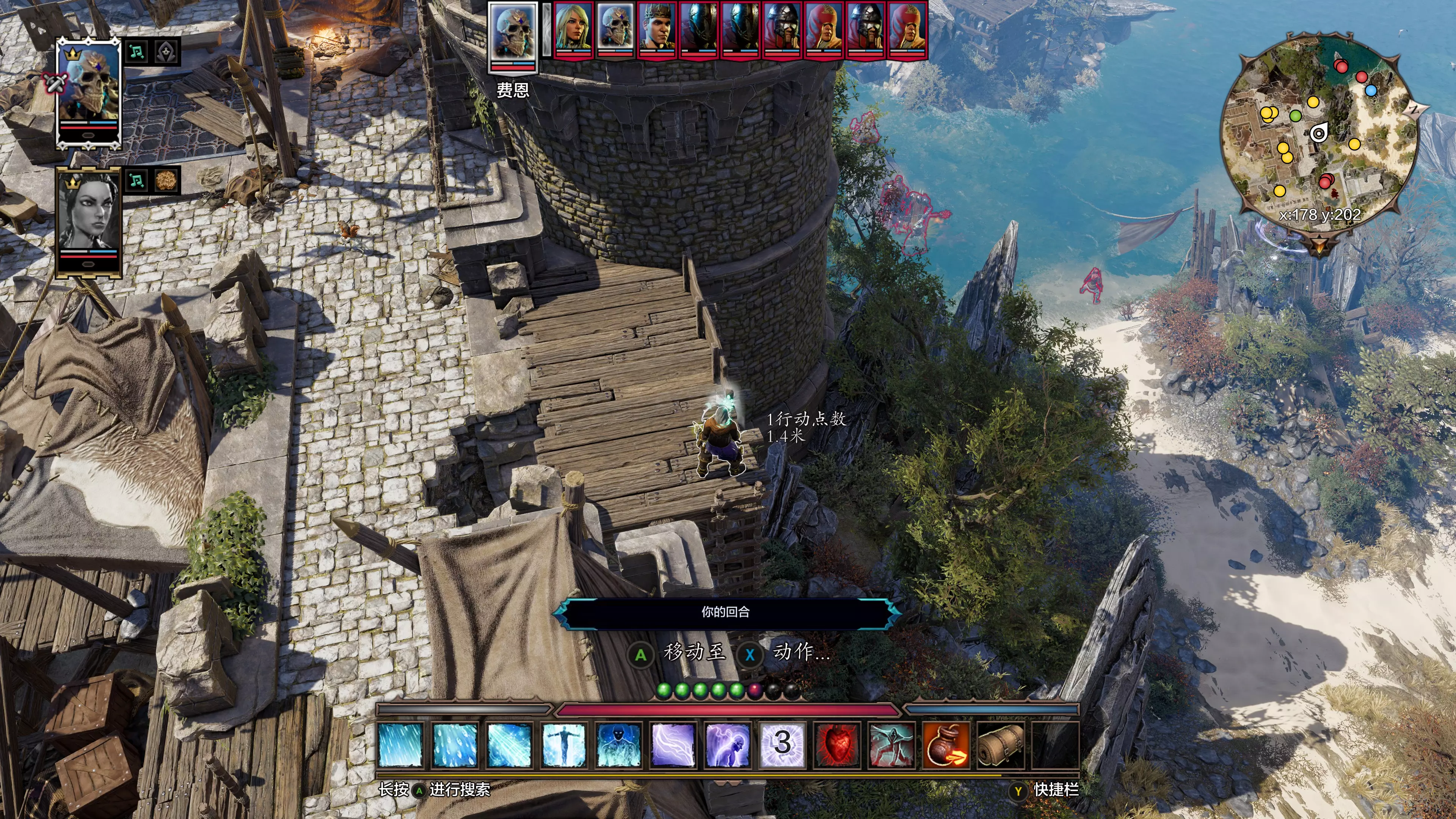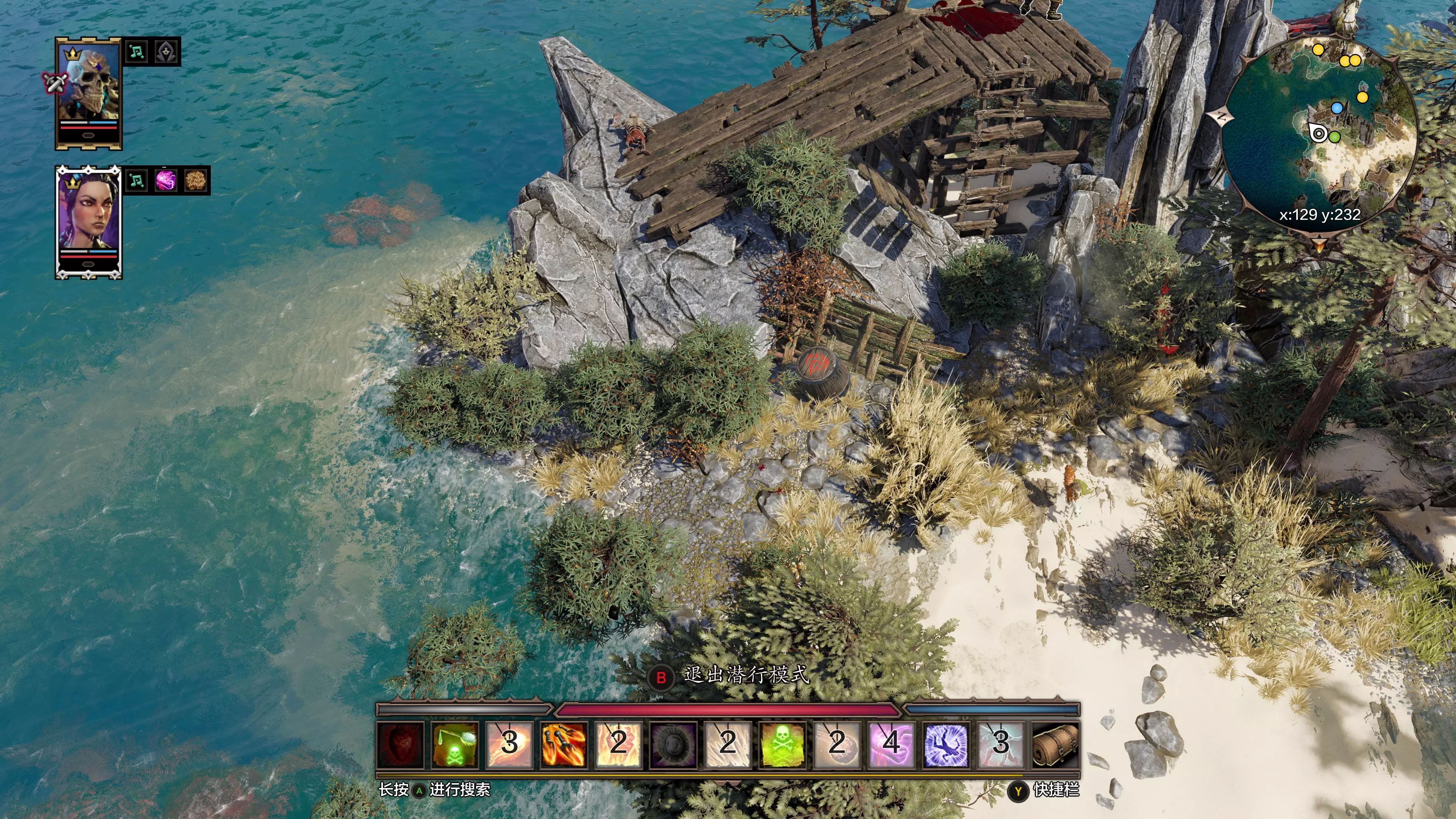 B角色站在海边的一块礁石上(坐标约为X 166, Y228,达莉丝未来的流放点预备)。务必注意左上那块位于海中间的礁石!!