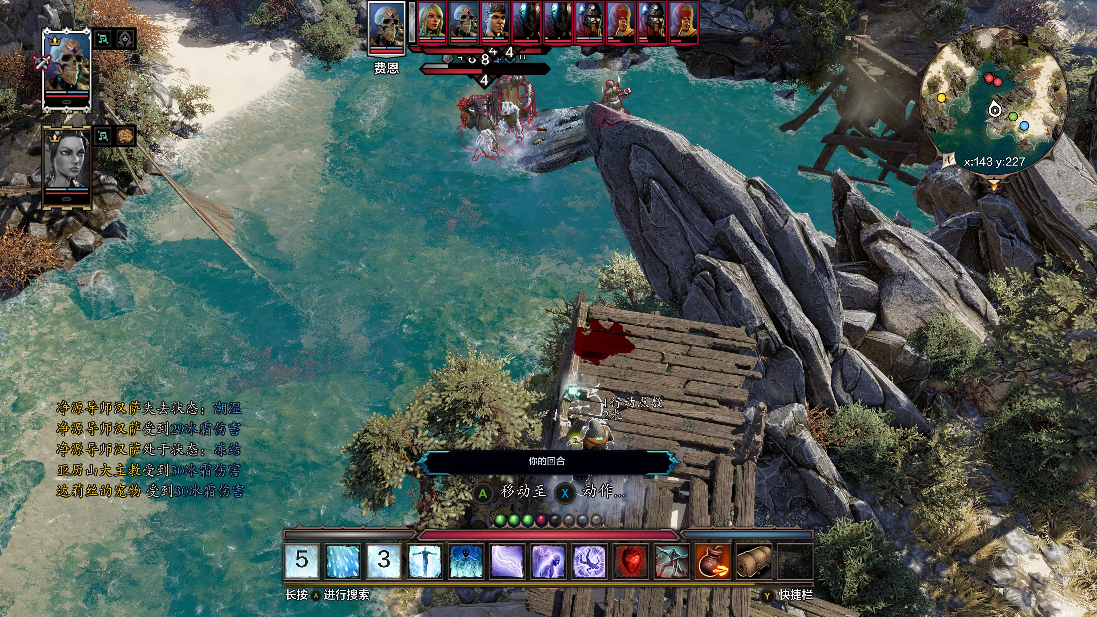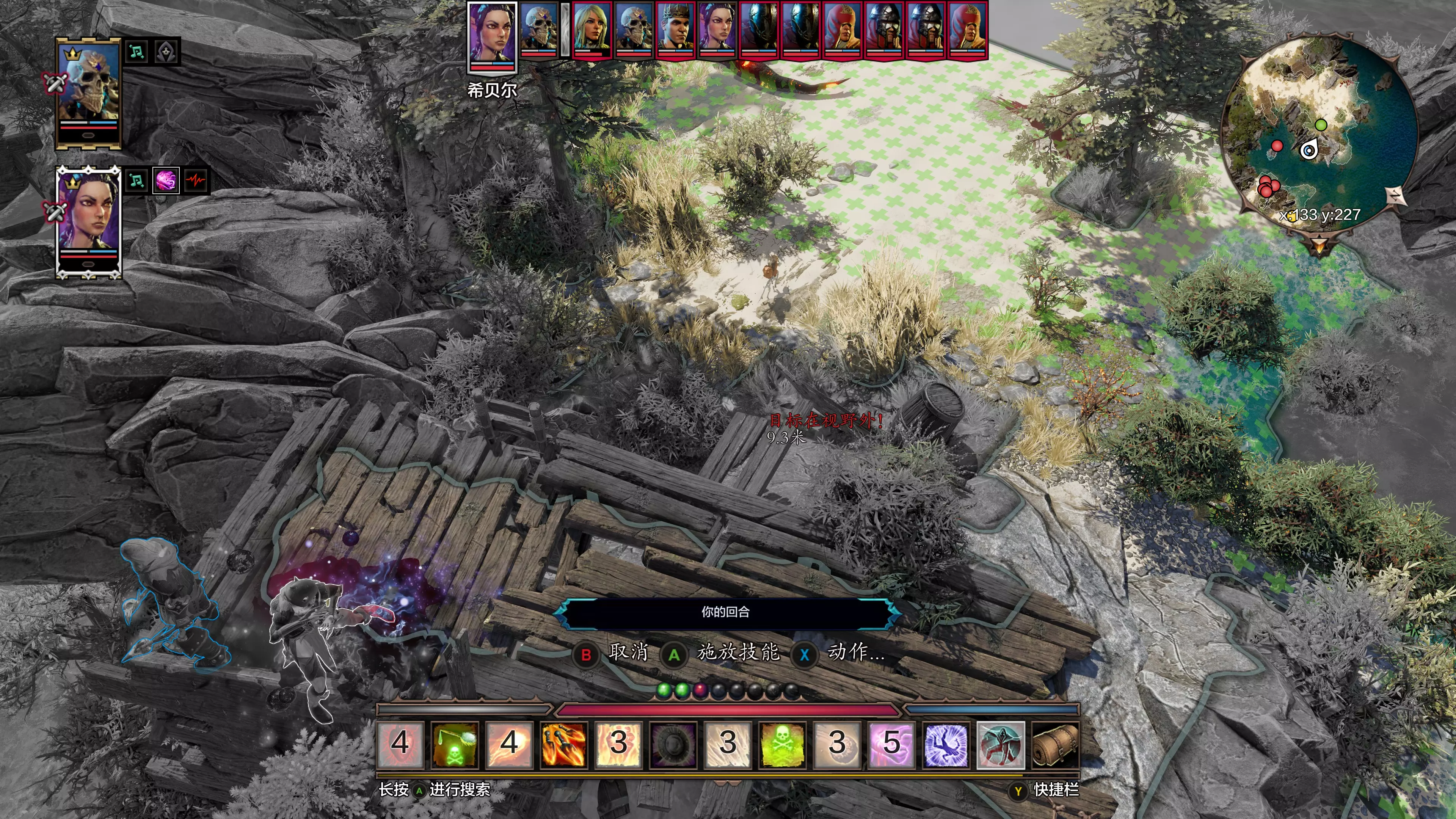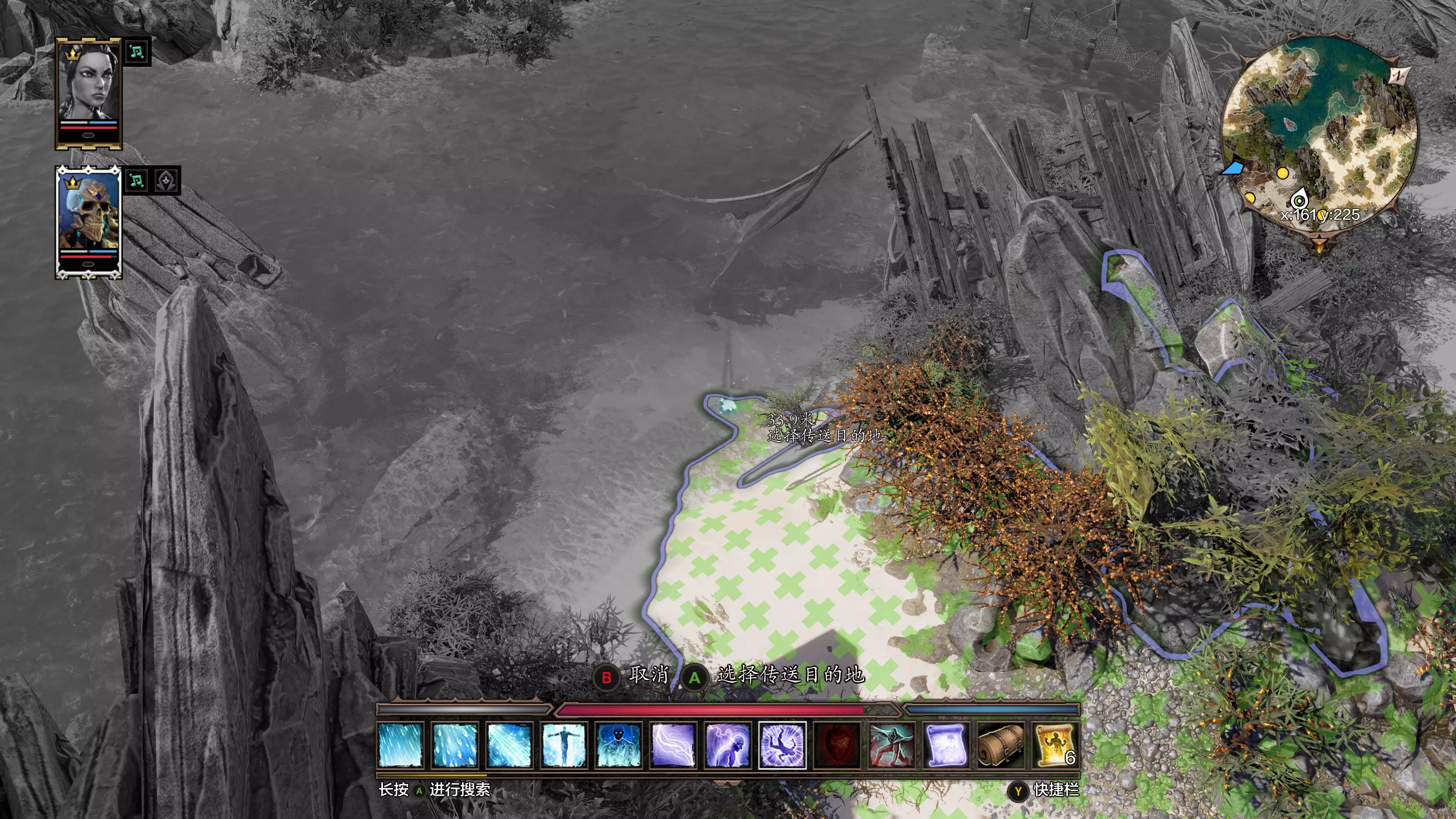 4. 此时B进入回合,使用传送术将达莉丝丢到海中间的礁石上。达莉丝不会游泳,无法攻击、无法移动。至此完成【达莉丝软禁安置】。