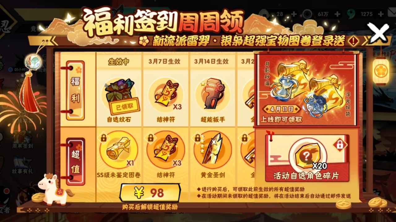 超值奖励包含SS级未鉴定图卷、结神符、金钥匙、活动自选忍者碎片x20等丰厚奖励,忍忍购买解锁超值奖励后,即可领取当前生效的超值奖励,也可领取此前的每期超值奖励。