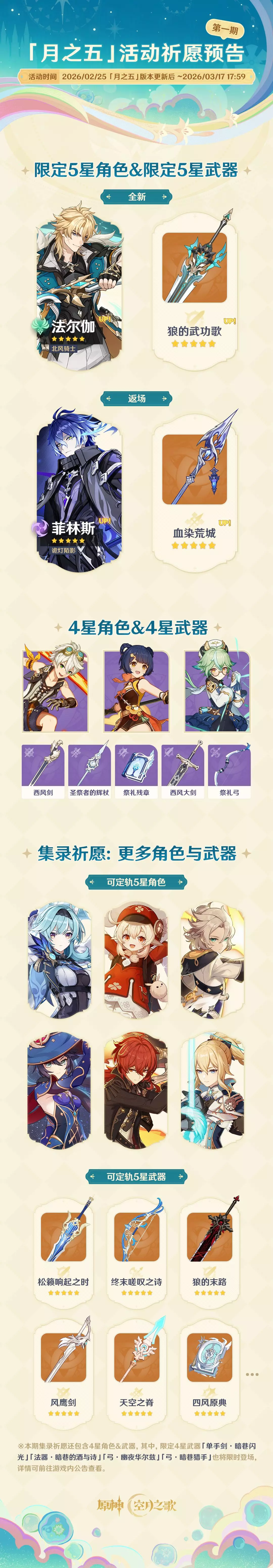 本期活动祈愿时间为2026/02/25 「月之五」版本更新后 ~ 2026/03/17 17:59。