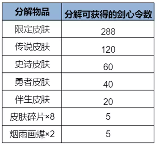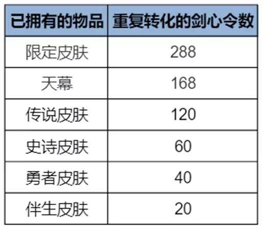 7、重复获得转化:抽取或领取到已拥有的皮肤将转化成一定数量的剑心令(抽奖过程、领取皮肤宝箱、兑换随机传说皮肤宝箱、随机史诗皮肤宝箱过程中均可能获得已拥有皮肤)。转化规则如下: