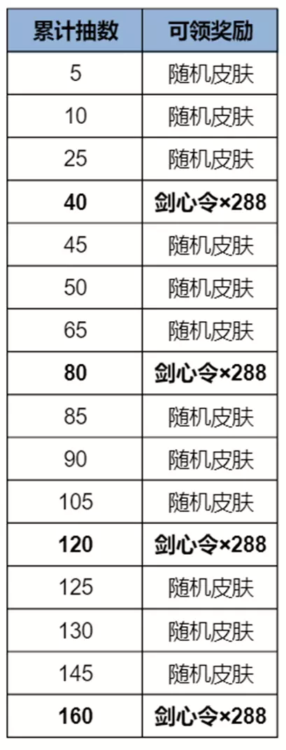 6、累抽领皮肤奖励:累抽5、10、25次可领随机皮肤宝箱,领取后随机开出【奖池】史诗/勇者/伴生中的皮肤1个,史诗/勇者/伴生皮肤的概率分别为10%/30%/60%,奖池内各品质皮肤均分前述概率。重复获取皮肤转化规则请见【第7条重复获得转化】;累抽40次可领剑心令×288,依次类推至160抽为止。