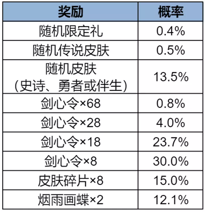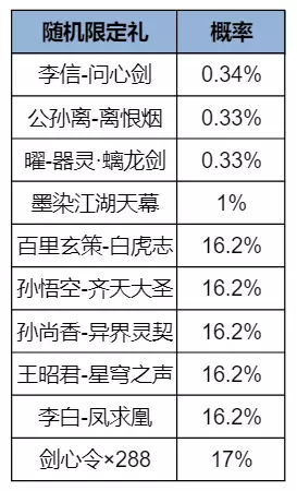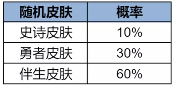 其中,随机限定礼、随机皮肤(史诗、勇者或伴生)可能随机开出的奖励内容和概率分布如下: