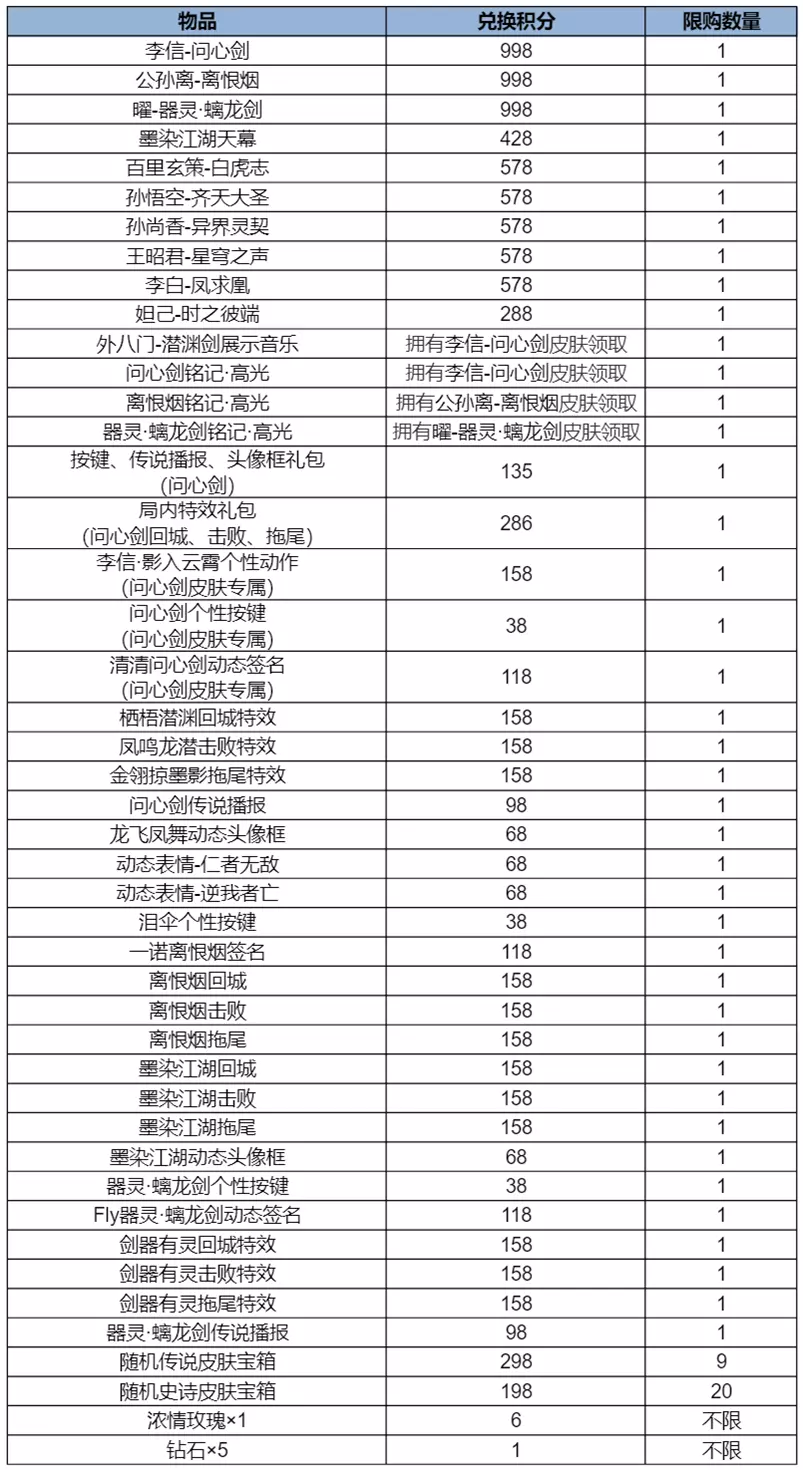 5、剑心令:可用于在兑换商店兑换李信-问心剑、公孙离-离恨烟、曜-器灵螭龙剑、墨染江湖天幕、百里玄策-白虎志、孙悟空-齐天大圣、孙尚香-异界灵契、王昭君-星穹之声、李白-凤求凰、妲己-时之彼端等奖励;通过每日福利、抽奖、在祈愿盒分解皮肤或道具,或获得已有皮肤转化等途径获取。