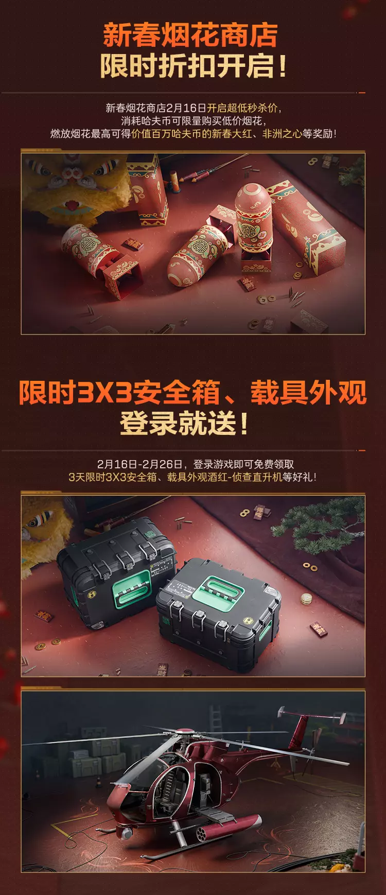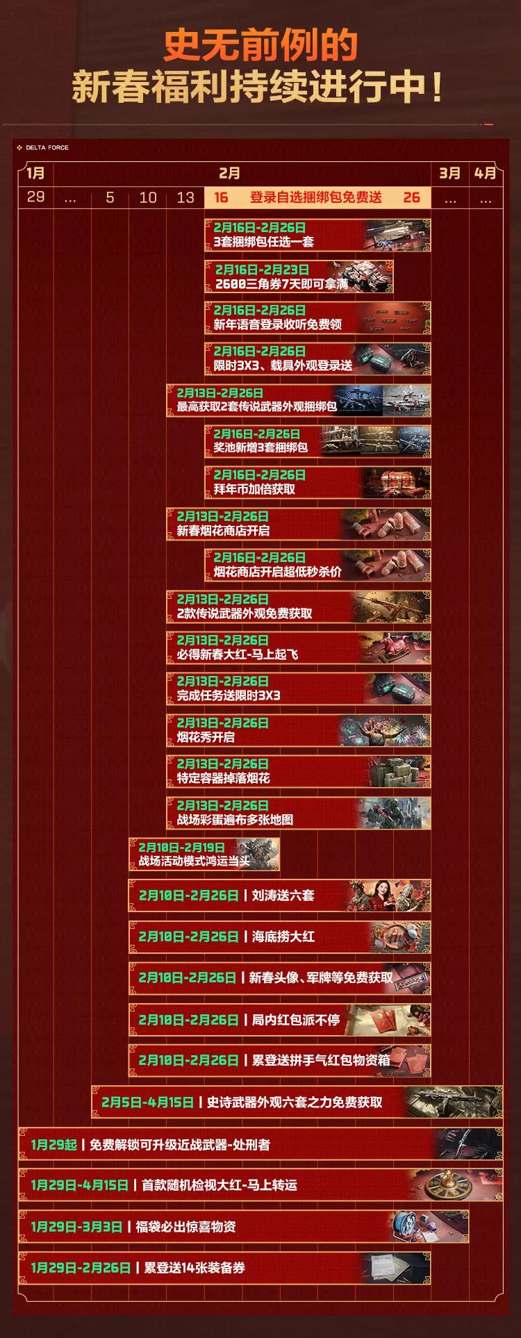 《三角洲行动》推出新春福利活动,2月16日起,登录可自选1套传说武器外观捆绑包,累登7天能拿满2600限时三角券,还可免费领新年语音、3X3安全箱、载具外观等福利,新春烟花商店也同步开启折扣。