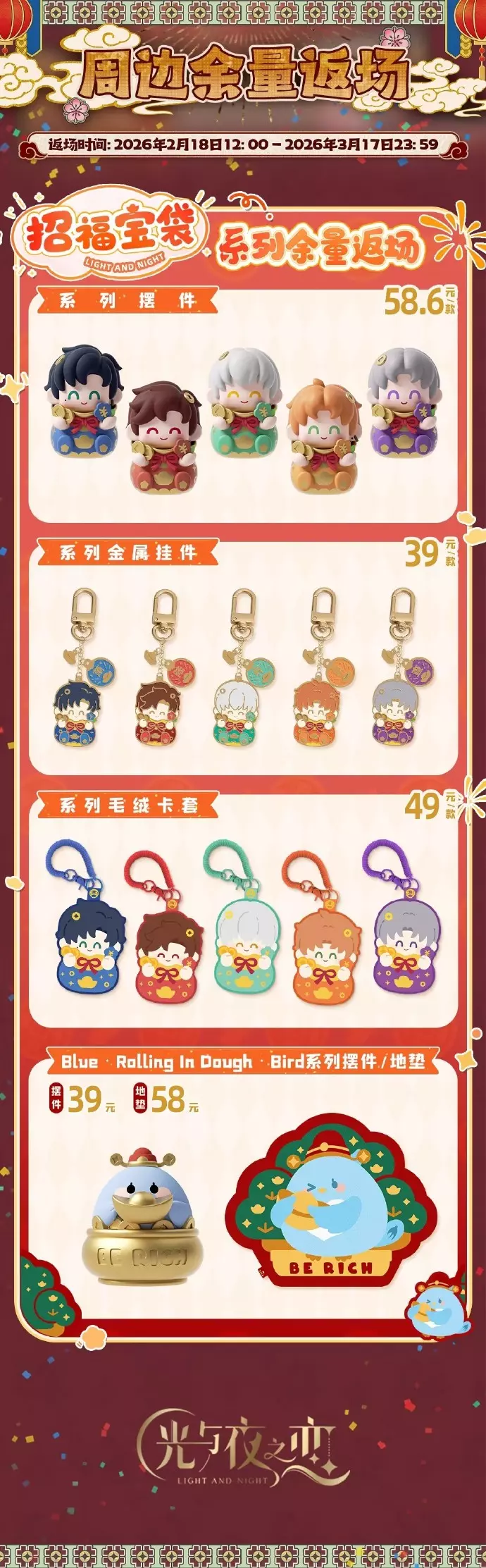 #光与夜之恋#马上好、骏马载鸿、神佑常在、阖乐满堂系列新品和招福宝袋、Blue·Rolling In Dough·Bird系列余量返场,将于2月18日12:00开售,设计师可以移步微信小程序或天喵商城进行选购。