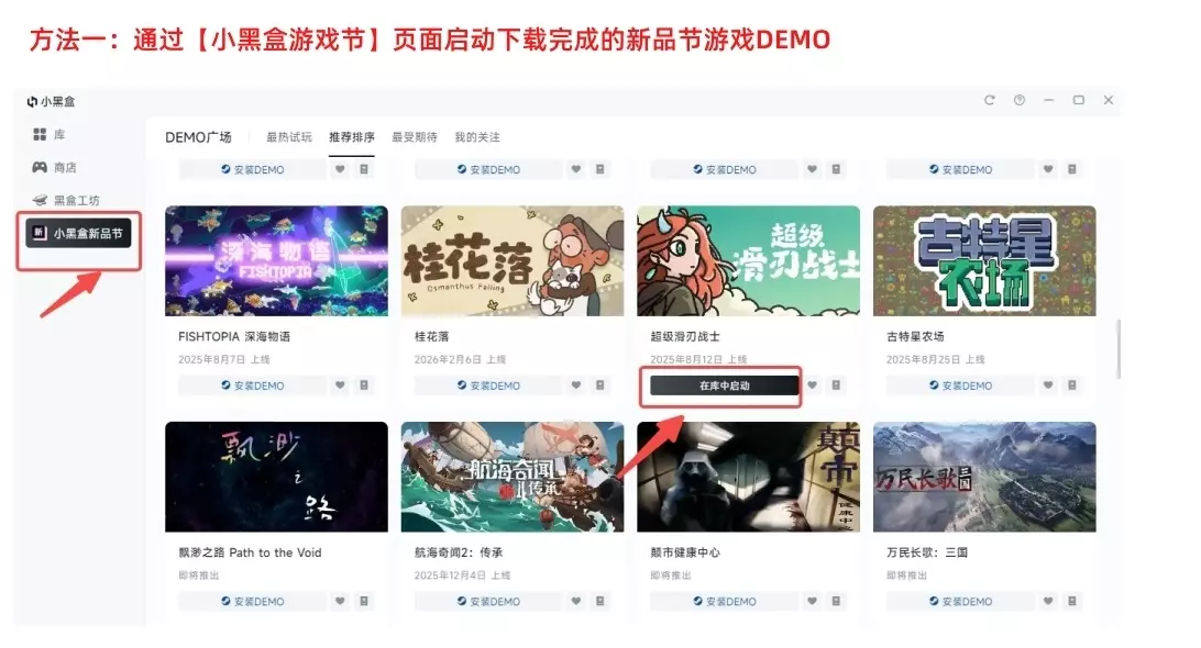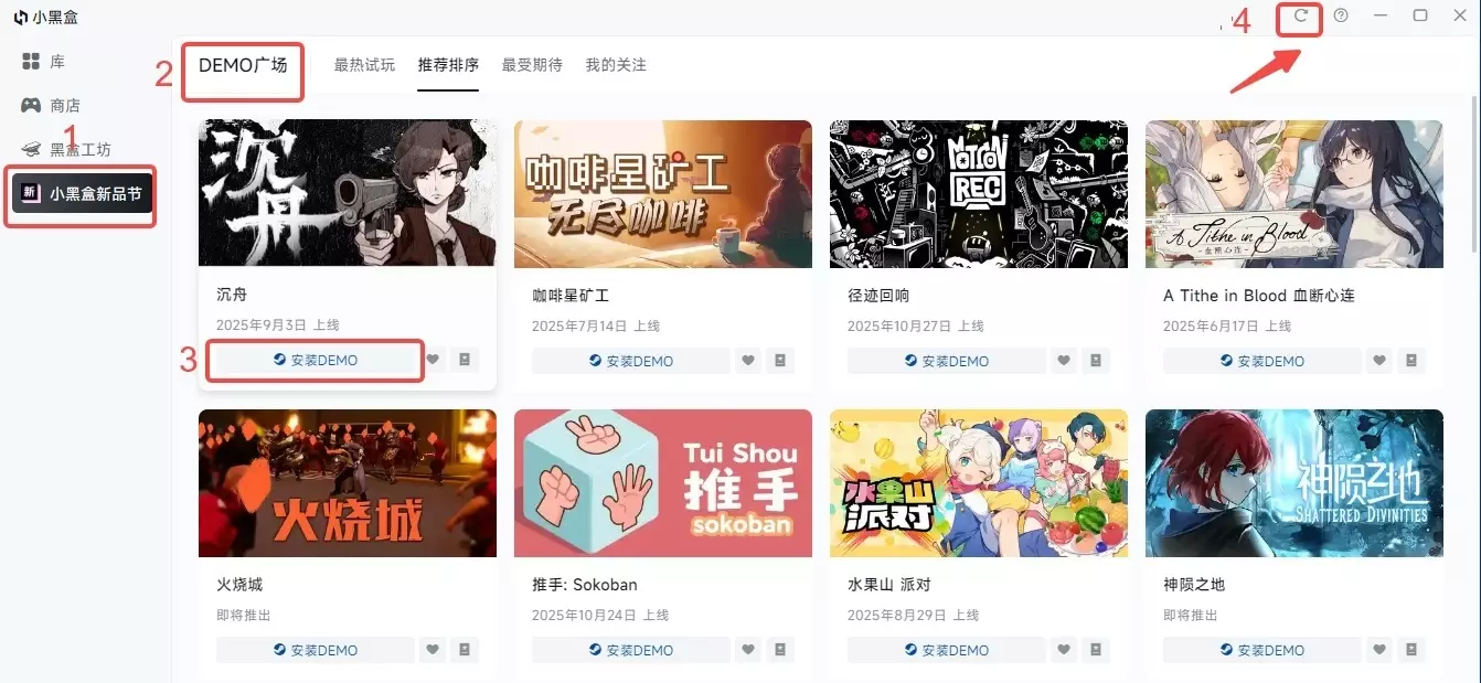 任务一 通过233乐园 PC 端安装1款新品节游戏 Demo 教程: 打开【233乐园 PC 端】 选择【233乐园新品节】 进入【Demo 广场】 选择需要安装的 Demo 安装完成后点击右上角刷新状态