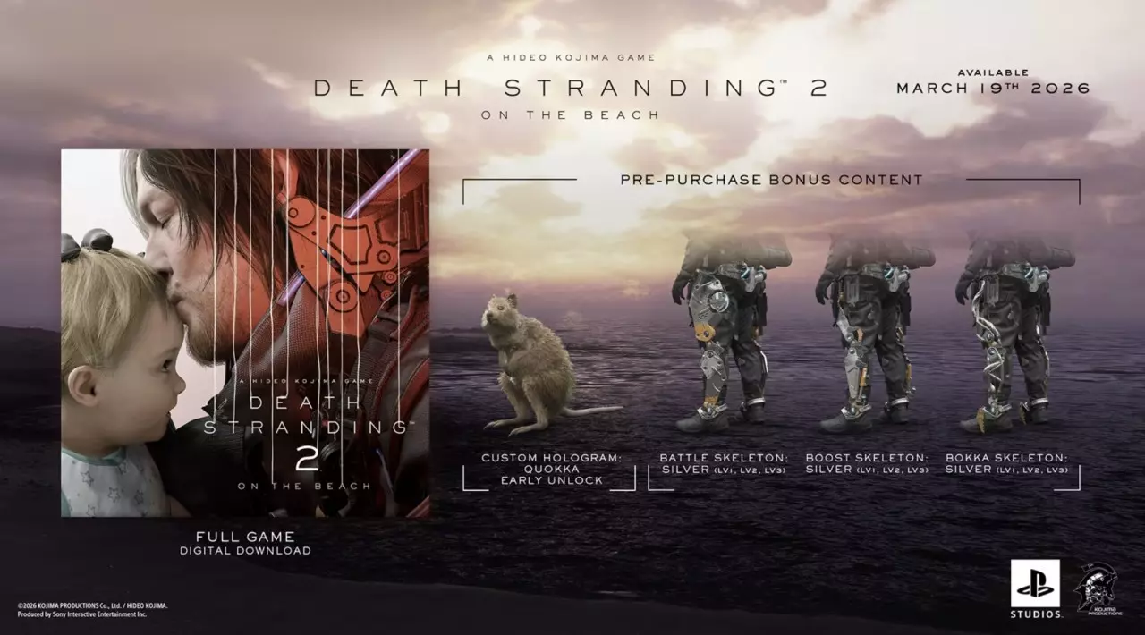 《死亡搁浅 2: 冥滩之上》 PC版,将于3月19日发售。 steam标准版:298元,豪华版: 338元。 Nixxes Software在PC平台精心重现了高度细致的自然景观与照片级真实的人物,同时致力于在多种硬件配置上实现流畅的游戏体验与出色的画面表现。现在预购,更有专属预购奖励! 预购即可获得: 定制全息投影:提前解锁的短尾矮袋鼠 战斗骨架:银色(Lv1、Lv2、Lv3) 强化骨架:银色(Lv1、Lv2、Lv3) 步荷骨架:银色(Lv1、Lv2、Lv3)
