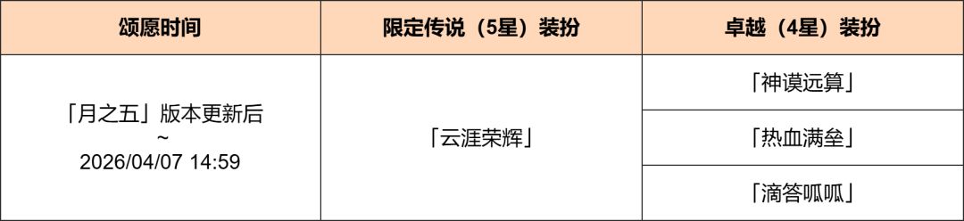 ● 活动期间内,限定传说(5星)装扮「云涯荣辉」以及卓越(4星)装扮「神谟远算」、「热血满垒」、「滴答呱呱」将进入奇偶的装扮活动颂愿!